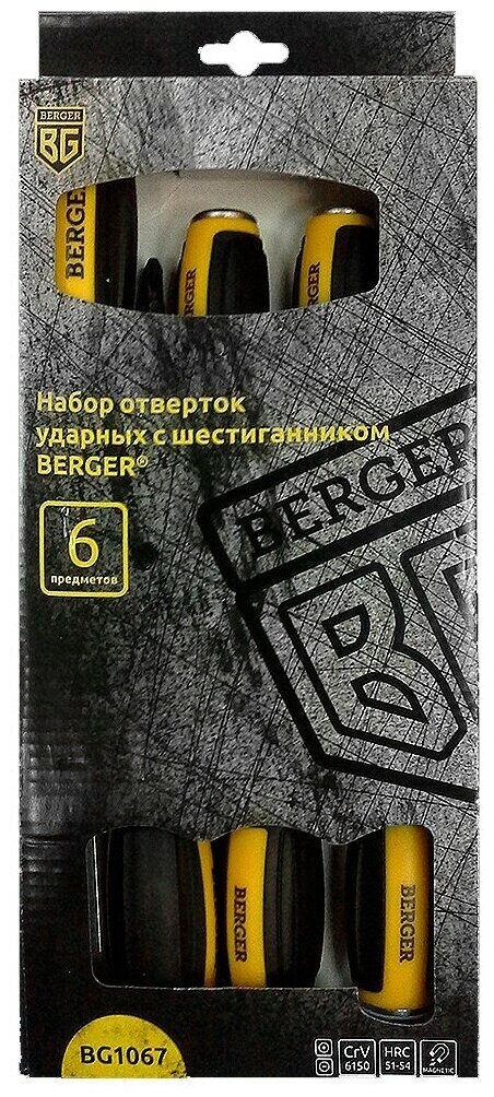 | Дополнительно в наборе | Набор отверток ударных с шестигранником 6 предметов BERGER. 3 шт. – отвертка ударная шлицевая:SL5.5 x 100мм; SL6.5 x 150мм; SL8 x 200мм; 3 шт. – отвертка ударная крестовая:PH1 x 100мм; PH2 x 125мм; PH3 x 150мм |