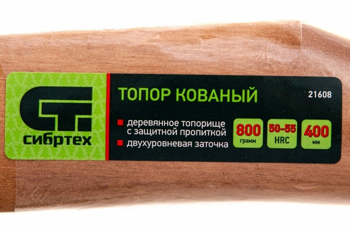 Кованый топор Сибртех длиной 400 м, с полотном весом 800 г, общим весом 1050 г, с прямым лезвием (тип Б2), поставляется в сборе с деревянным топорищем. Предназначен для рубки, тесания и грубой обработки древесины. Используется для заготовки дров и выполнения плотницких работ.ПреимуществаОптимальный показатель прочности - полотно изготовлено из стали 45 методом ковки.Высокий ресурс - рабочая кромка твердостью 50-55 HRC долго сохраняет остроту.Долговечность - топорище изготовлено из древесины твердых лиственных пород и пропитано защитным составом