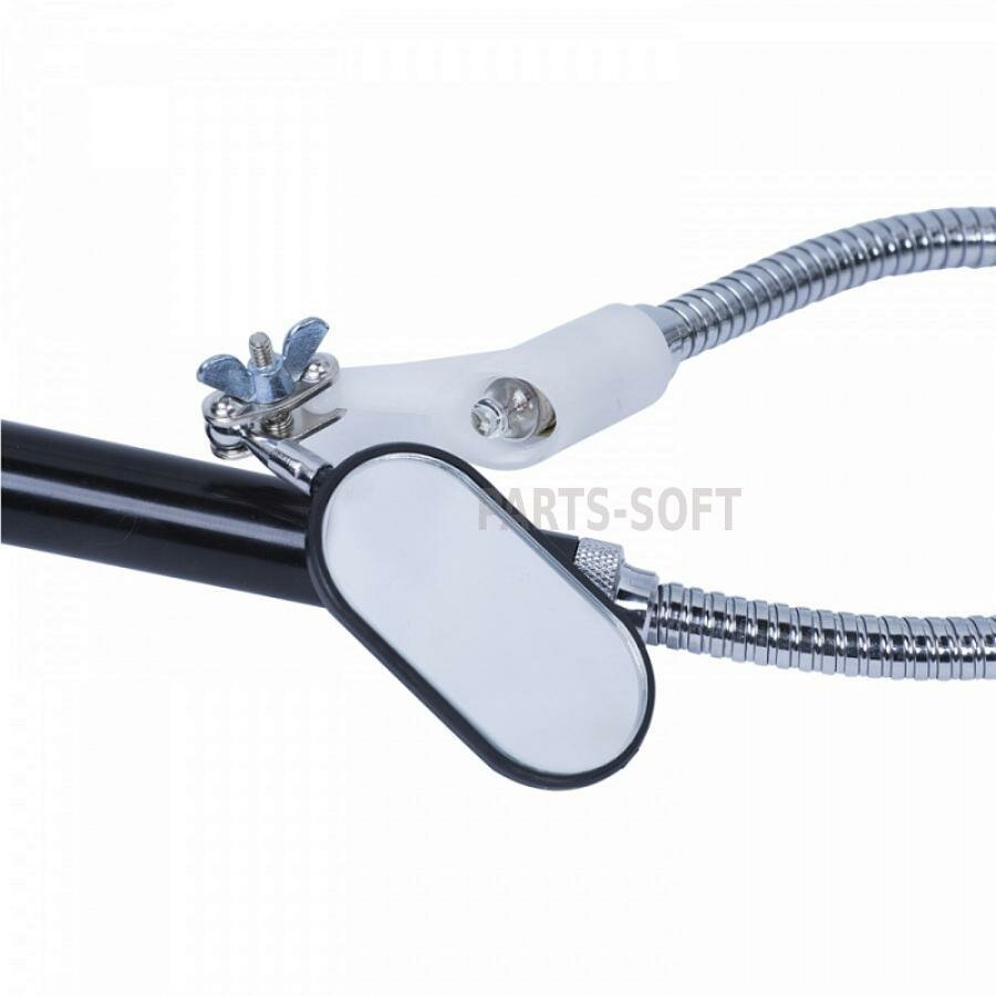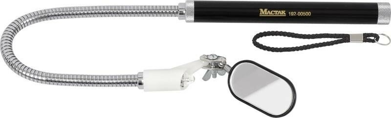 Зеркало на гибком стержне 500мм мастак с подсветкой служит для осмотра и диагностики поломок в труднодоступных местах у различных узлов и агрегатов, например, при ремонте автомобилей. Для удобства переноски изделия на кончике рукоятки предусмотрена наручная петля. Устройство работает от батареек 2хАА (приобретаются отдельно). Вес - 0.226 кг.