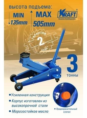 Гидравлический автомобильный подкатной домкрат KRAFT (крафт) предназначен для поднятия грузов. Отличается простотой обслуживания и надежностью в эксплуатации, позволяя осуществить плавный подъем груза и его точную остановку на заданной высоте при небольшом рабочем усилии. Функциональные особенности: Высокая устойчивость, предохранительный клапан, удобная ручка. Высота подъема: 135-500 мм. В разделе авто товаров ТМ KRAFT (Крафт) можно встретить большое разнообразие домкратов, отличающихся по способу действия и характеристикам. У каждого вида имеются свои характерные преимущества, позволяющие применять их в тех или иных ситуациях. Широкий ассортимент включает в себя гидравлические бутылочные, гаражные подкатные, механические ромбические, механические бутылочные, реечные и электрические домкраты. В каждой группе представлено множество разнообразных моделей, отличающихся рабочими характеристиками и принципами работы, подходящих для бытового и для профессионального использования. Отличается простотой обслуживания и надежностью в эксплуатации, позволяя осуществить плавный подъем груза и его точную остановку на заданной высоте при небольшом рабочем усилии. Функциональные особенности: Высокая устойчивость, предохранительный клапан, удобная ручка, Морозостойкое масло (-45°C). (min 135mm-max 500mm)