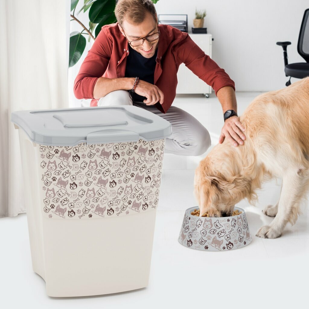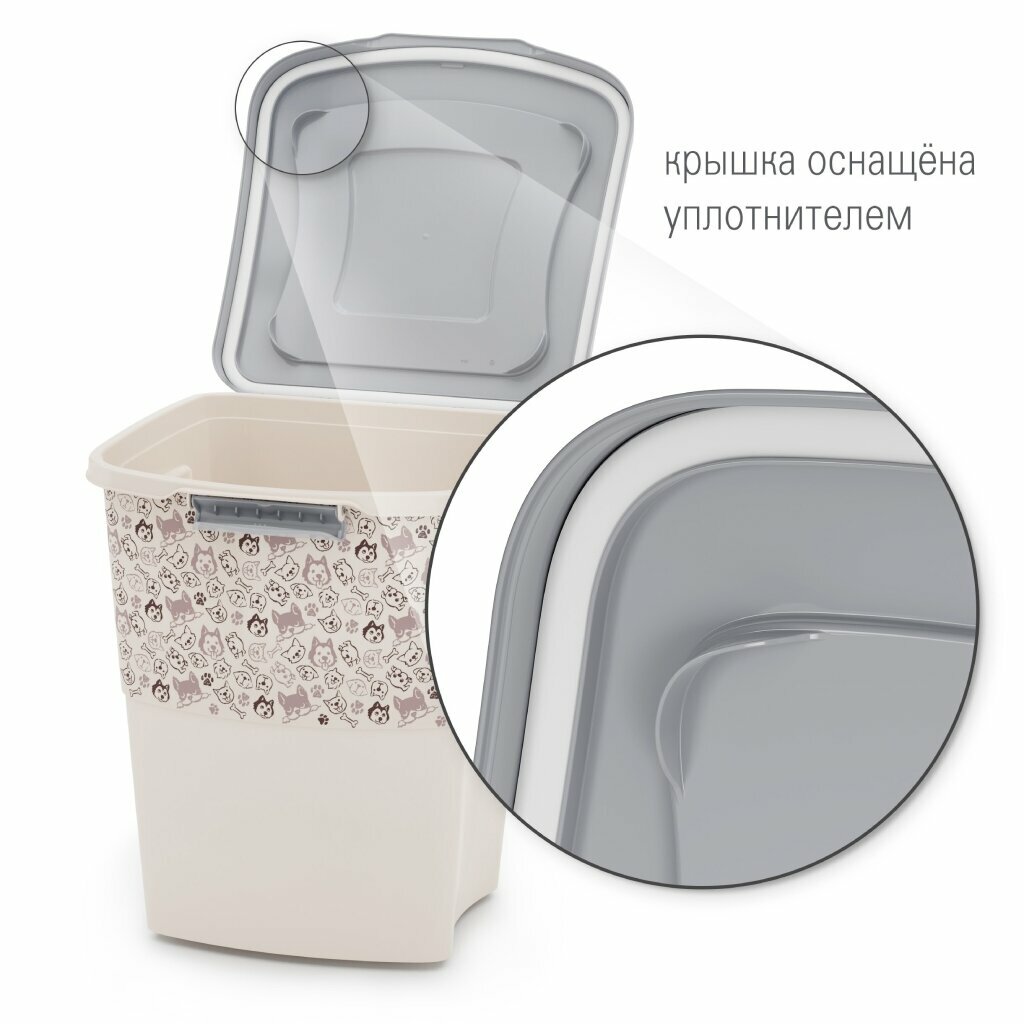 Контейнер вмещает от 14,5 до 16 кг сухого корма в зависимости от плотности корма и размера гранул. Изделие оснащено колесиками для удобства транспортировки и крышкой, которая плотно прилегает к контейнеру за счёт уплотнителя, тем самым обеспечивая герметичность. Хранение корма в специальной таре предотвращает заветривание корма, попадание влаги, сохраняя вкусовые качества продукта. Контейнер выполнен из пищевого высококачественного пластика, отличается особой прочностью и надежностью. Также стоит отметить, что способ хранения сухих кормов в специальной таре обеспечивает порядок и чистоту в доме.