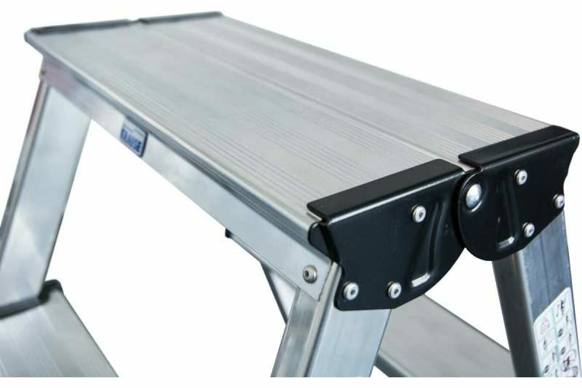 | Прочие особенности и свойства | Легкая двухсторонняя алюминиевая стремянка,пригодная для выполнения самых разнообразных работ. - Мощный, ударопрочный тип металлического шарнирного соединения - Прочное крепление ступеней к боковинам 6 заклепками придает конструкции высокую жесткость - Нескользящие, профилированные и щадящие пол наконечники опор |