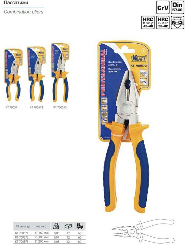 Пассатижи комбинированные 200 мм (плоскогубцы) KRAFTПассатижи комбинированные Kraft – это универсальный и надежный инструмент для монтажных и ремонтных работ. Изготовленные из высококачественной инструментальной стали, они обладают прочностью, долговечностью, а также устойчивостью к износу и коррозии.Пассатижи оснащены удобными двухкомпонентными рукоятками с противоскользящим эффектом, что обеспечивает надежный захват и максимальный комфорт при работе. Кроме того, на ручках имеются специальные мягкие вставки, которые уменьшают нагрузку на руку и предотвращают возникновение мозолей или натирания.Важной особенностью пассатижей является наличие двух рабочих кромок – плоских и круглых, что позволяет работать с различными видами материалов и крепежных элементов. Благодаря компактным размерам и легкому весу пассатижи удобны для использования в труднодоступных местах и при выполнении длительных работ.