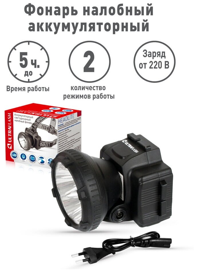 Фонарь Ultraflash электрический светодиодный налобный аккумуляторный. Цвет корпуса: матовый черный. Материал корпуса - пластик. Источники света - 1 светодиод с потребляемой мощностью 0, 5Вт и суммарным световым потоком - до 18 люмен. Дистанция освещения - до 20 метров. 2 режима работы - в режимах полной / половины мощности. Выключатель: двухпозиционный кнопочный. Время работы до 5 часов. Время заряда 7 часов. Комплектация: фонарь, герметичный свинцово-кислотный аккумулятор DC 4 вольт 0, 42 А-ч, сетевой кабель для заряда от сети ~220 В, поворотный отражатель, эластичный головной ремешок, инструкция, упаковка. Степень пыле-влаго-защиты IP22. Упаковка - коробка. Максимальный линейный размер фонаря 6 см. Размер упаковки 9 x 7 x 6, 5 см. Вес без упаковки 0, 11 кг. Вес в упаковке 0, 13 кг.