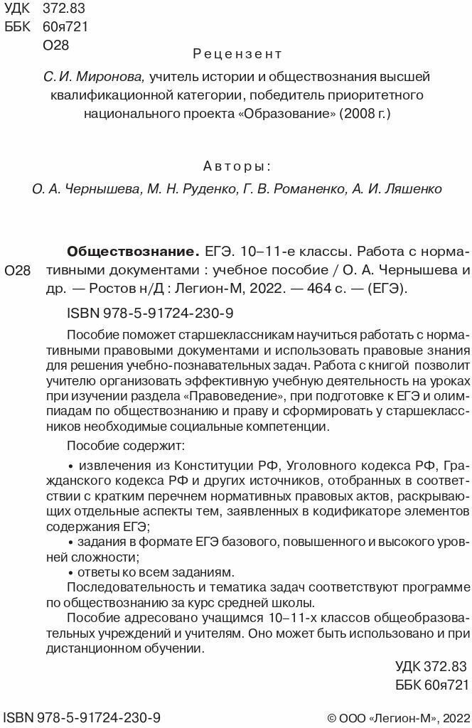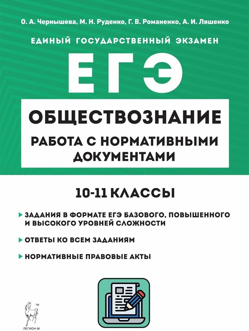 ЕГЭ Обществознание. 10–11 классы. Работа с нормативными документами (Чернышева Ольга Александровна; Ляшенко Анна Игоревна; Руденко Марина Николаевна; Романенко Галина Васильевна); Легион, 2023