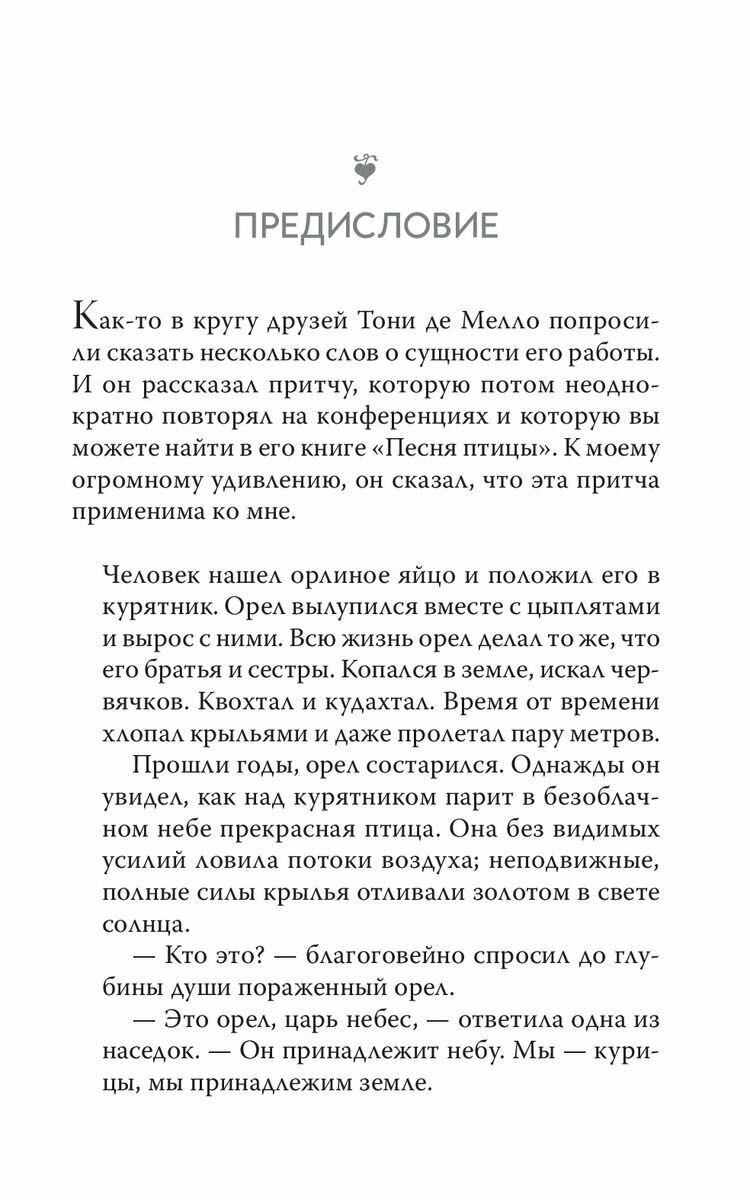 Энтони де Мелло известен у нас как автор глубоких притч «в восточном духе». Но он был христианским священником и в своей родной Индии прославился в первую очередь увлекательными, порой провокативными духовными беседами и проповедями. Самые яркие из них собраны на этих страницах. «Осознание» — книга о пробуждении, об изменении себя, о настоящей жизни. «Реальность — вот она; «Бог», чем бы Он ни был, — вот Он. Все здесь, вокруг вас, только руку протяни. Бедная маленькая рыбка спрашивает: «Простите, я ищу океан, не подскажете, как его найти?» Жалкое зрелище, правда? Если бы мы дали себе труд открыть глаза и увидеть, то всё бы поняли».