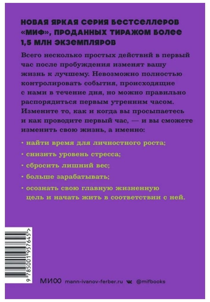 Утренние ритуалы, которые предлагает осуществлять автор этой книги, помогли десяткам тысяч людей изменить свою жизнь, почувствовать себя лучше и успевать больше. Из книги вы узнаете, как первый час дня определяет ваш успех и позволяет вам раскрыть свой потенциал полностью. Измените то, как и когда вы просыпаетесь и как проводите первый час - и вы сможете изменить свою жизнь, а именно: