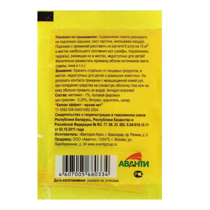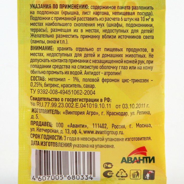 | Состав | метомил - 1 %, половой феромон цис-трикозен - 0,25 %, битрекс, краситель, сахар |