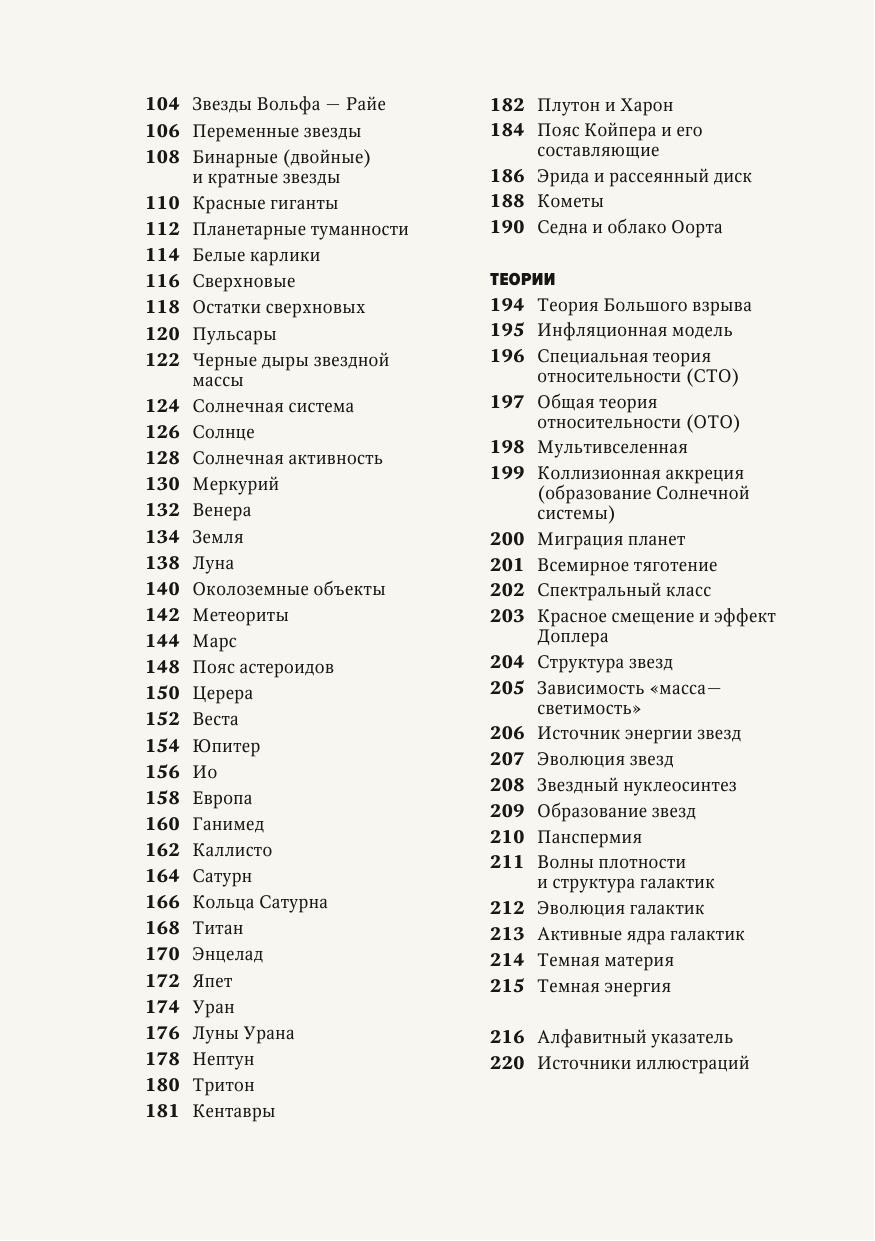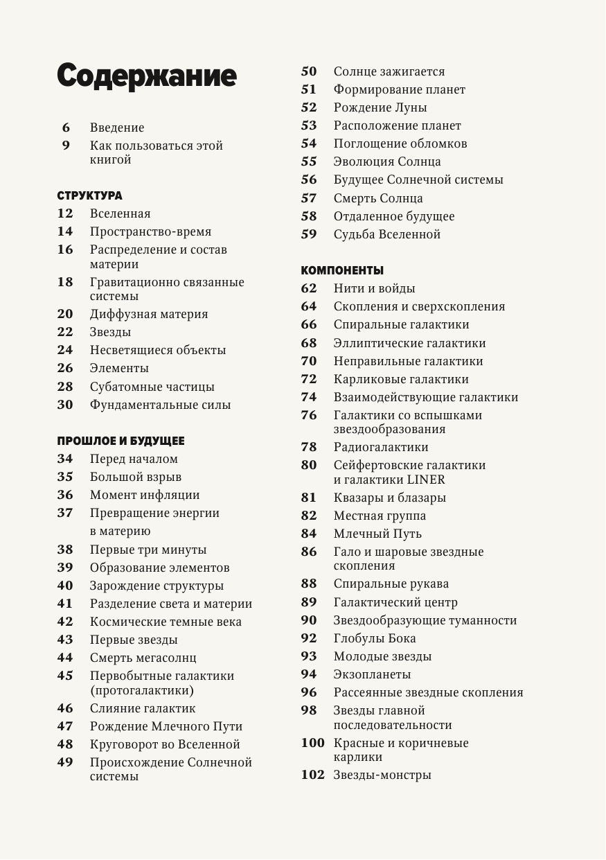 В книге 4 раздела: Структура, Прошлое и будущее, Компоненты, Теории. ее можно последовательно, чтобы проследить эволюцию научной мысли, или отдельными секциями в любом порядке. Перекрестные ссылки внизу каждой страницы помогают ориентироваться в разделах, а врезки сообщают детали биографии ключевых ученых и массу дополнительной информации.