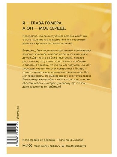 Но кто бы мог подумать, что этот мурчащий черный комочек превратится в Гомера — самого смелого и предприимчивого кота в мире. Кто мог предсказать, что именно незрячий питомец подаст Гвен пример жизнелюбия и веры в свои силы, поможет обрести любовь и интересную работу. Да что там, даже защитит ее от грабителя!