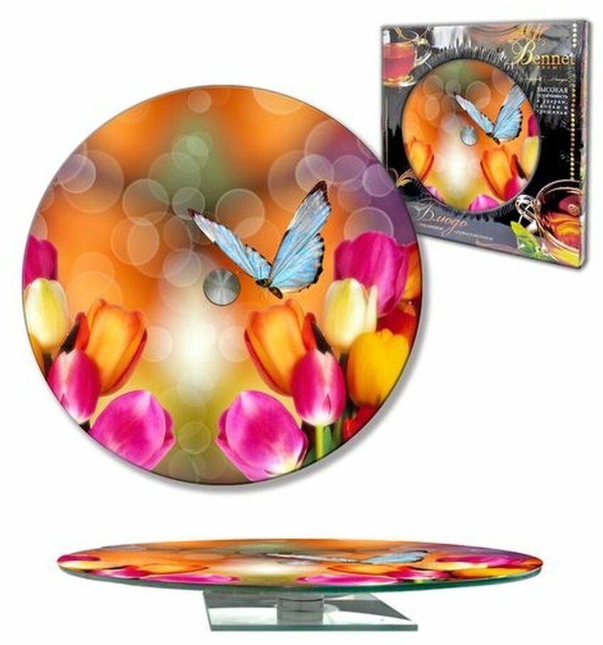 Блюдо сервировочное LarangE, вращающееся, диаметром 28 см выполнено из ударопрочного стекла. В серии декоративных тарелок, каждый сможет выбрать картину на свой вкус. Подставка вращающаяся для торта упакована в прочную и красивую коробку и станет прекрасным подарком. Вращающаяся тарелка изготовлена из высококачественного, ударопрочного стекла. Может служить украшением любого современного кухонного интерьера. Необходимо помнить, что несмотря на свою прочность, боится грубого механического воздействия. Вращающееся блюдо LarangE выполнено из качественного закаленного стекла и украшено изящным рисунком. Блюдо прекрасно подойдёт для сервировки не только тортов и пицц, но и различных закусок. Идеально украсит ваш праздничный или обеденный стол, а красивая упаковка превращает посуду в отличный подарок. Изделие оснащено ножкой с вращающим механизмом, которое поможет вам легко нарезать продукты и взять их, не пододвигая постоянно подставку. Посуда легко моется, обладает непористой поверхностью, не впитывает запахи. После использования протереть влажной салфеткой. Не замачивать, не применять абразивные и моющие средства. Не использовать в ПММ, микроволновой печи и духовом шкафу.