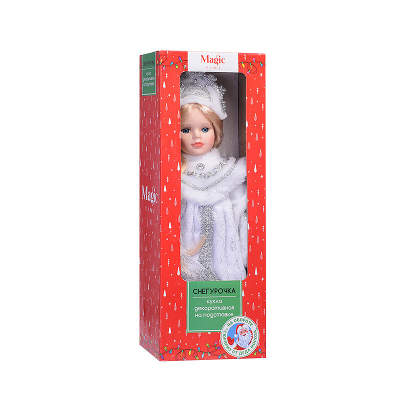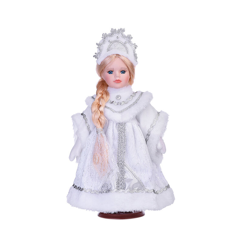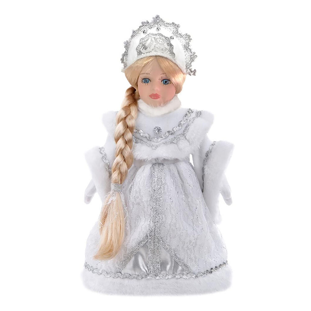 Декоративная кукла Снегурочка выполнена из высококачественной керамики. Туловище куклы мягкое набивное. Трогательные глаза обрамлены пышными ресницами, а светлые волосы заплетены в косу. Кукла максимально приближена к живому прототипу – юной леди с румянцем на щеках. Снегурочка наряжена в роскошную шубку, декорированную тесьмой и блестками, а голова украшена кокошником. Кукла устанавливается на пластиковую подставку, благодаря которой вы можете поместить ее в любом понравившемся месте. Такая кукла займет достойное место в вашей коллекции или станет чудесным подарком на Новый год.