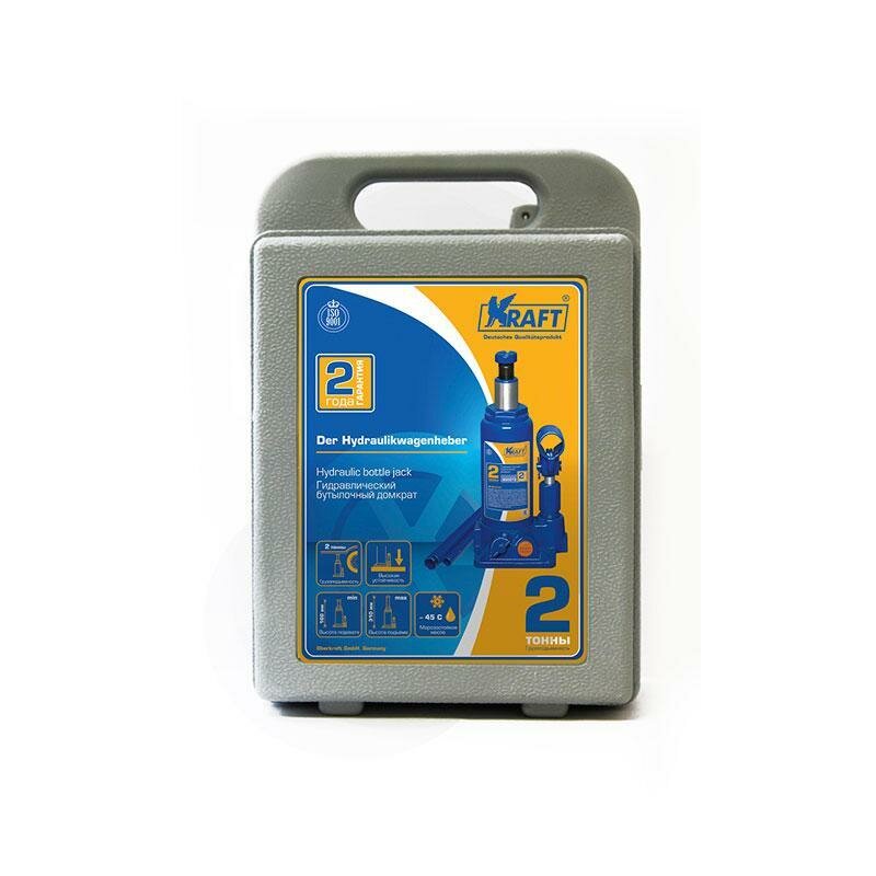 Домкрат автомобильный бутылочный гидравлический 2 т. (в кейсе) ( min 160mm-max 310mm). Гидравлический бутылочный домкрат "Kraft" предназначен для поднятия грузов. Домкрат позволяет осуществить плавный подъем груза и его точную остановку на заданной высоте при небольшом рабочем усилии. Изделие имеет предохранительный клапан, который в случае неправильной эксплуатации (масса поднимаемого груза будет больше грузоподъемности конкретной модели) сработает и плавно опустит груз. Технические характеристики: - грузоподъемность: 2 тонны, - минимальная высота: 160 мм, - максимальная высота: 310 мм, - ход штока: 90 мм, - ход удлинительного винта: 60 мм Функциональные особенности: - высокая устойчивость, - выдвижной винт, - складная рукоятка, - предохранительный клапан, - удобная ручка, - морозостойкое масло (-45°C). Комплектация: - механический бутылочный домкрат, - рукоятка домкрата, - руководство по эксплуатации, - кейс.