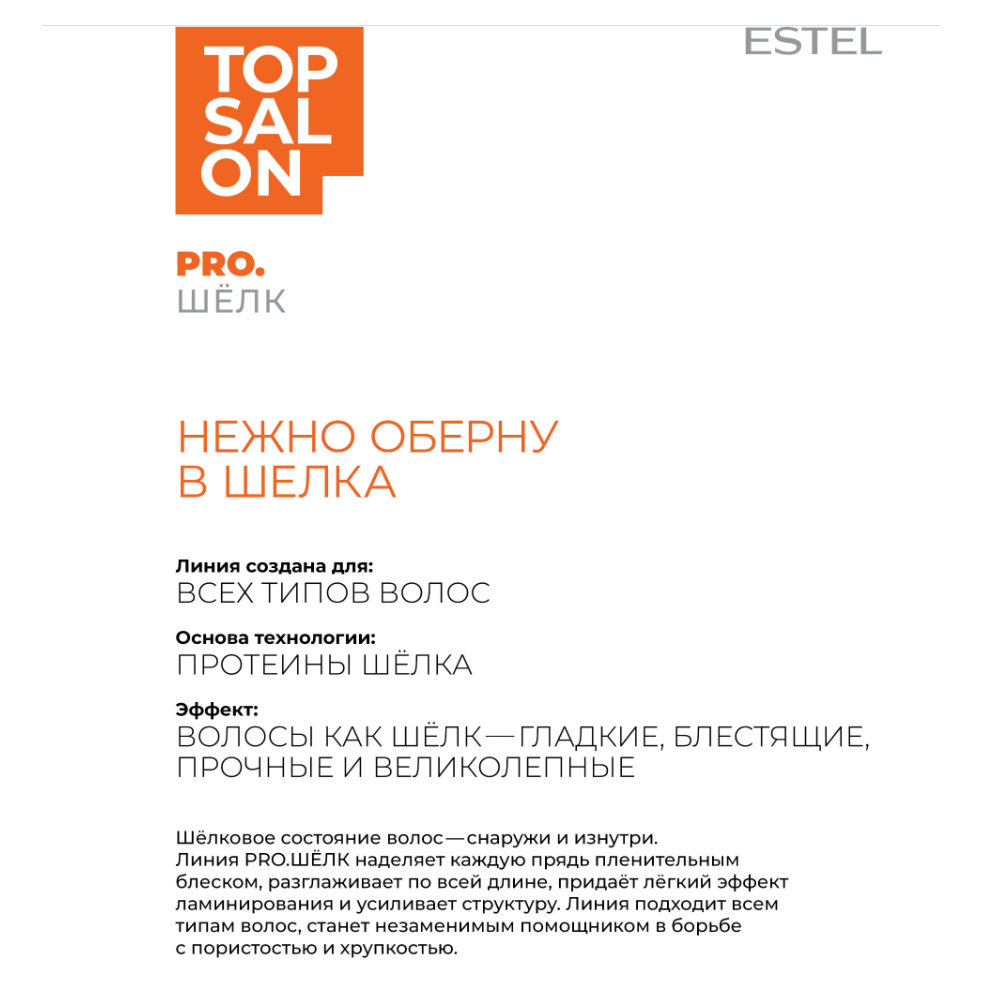 Pro.Шелк наделяет каждую прядь пленительным блеском, разглаживает по всей длине и усиливает структуру. Подходит всем типам волос, станет незаменимым помощником в борьбе с пористостью и хрупкостью.