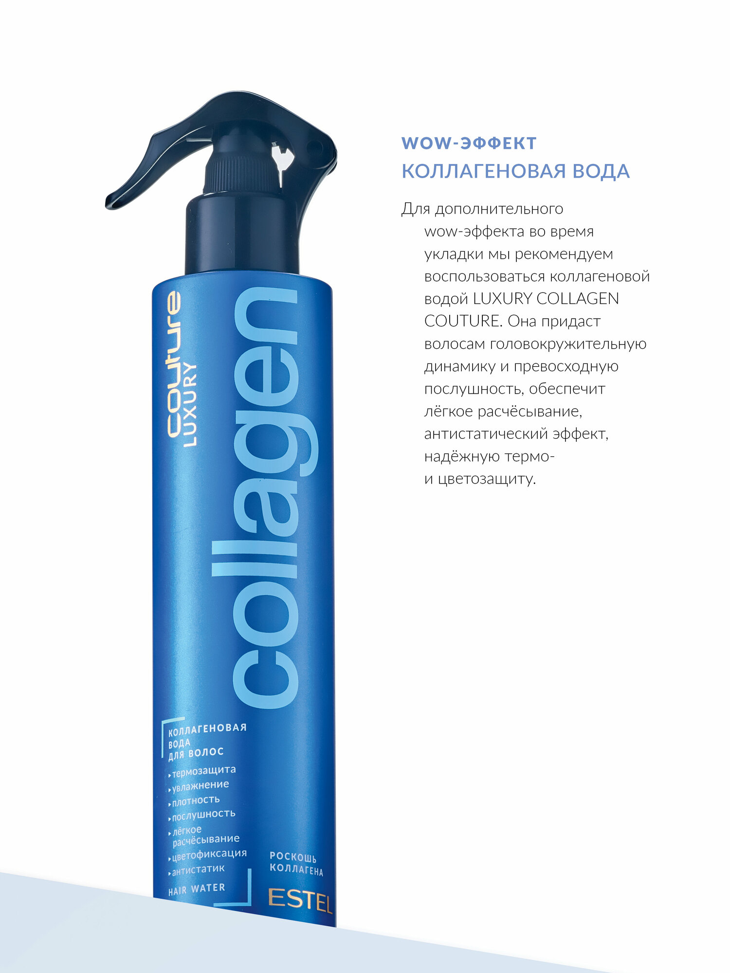 Для дополнительного wow-эффекта во время укладки. Коллагеновая вода придаст волосам головокружительную динамику и превосходную послушность, обеспечит лёгкое расчёсывание, антистатический эффект, надёжную термо- и цветозащиту.