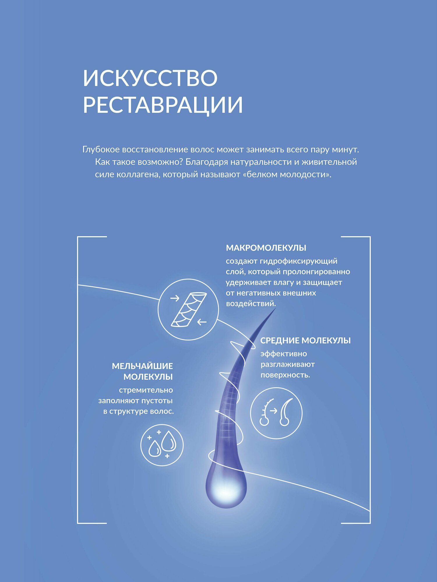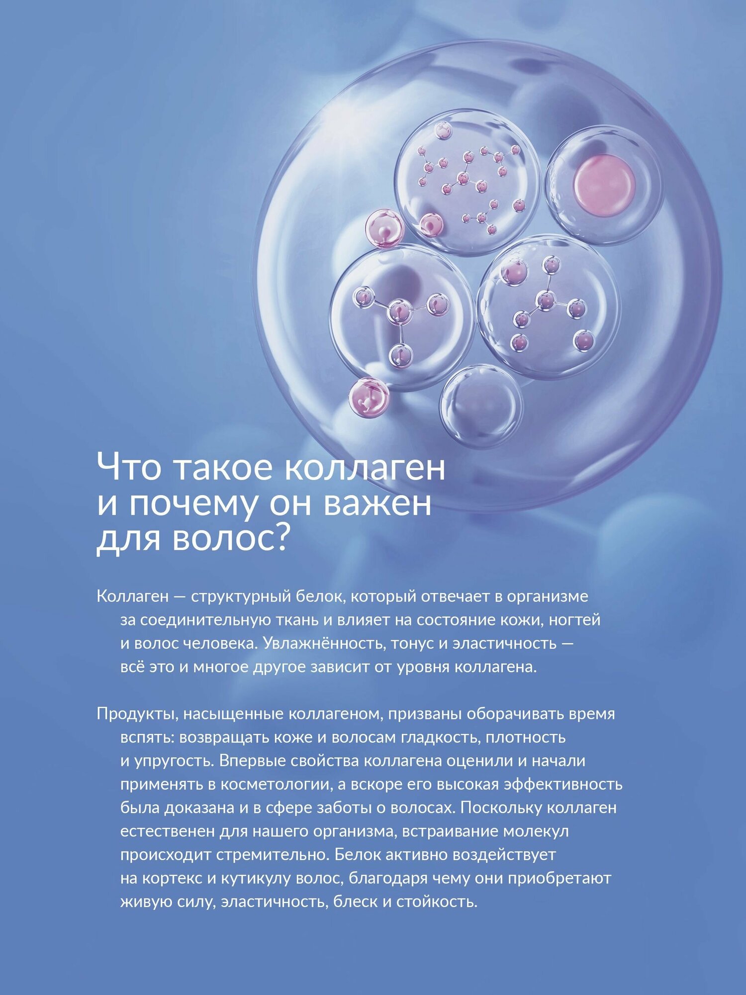 Коллаген - белок молодости, отвечающий в организме за соединительную ткань и влияющий на состояние кожи, ногтей и волос. Формула построена на натуральном коллагене разной молекулярной массы. Благодаря этому процедура обеспечивает тройное восстановление волос, экстраувлажнение, сохранение оттенка и чистое сияние красоты.