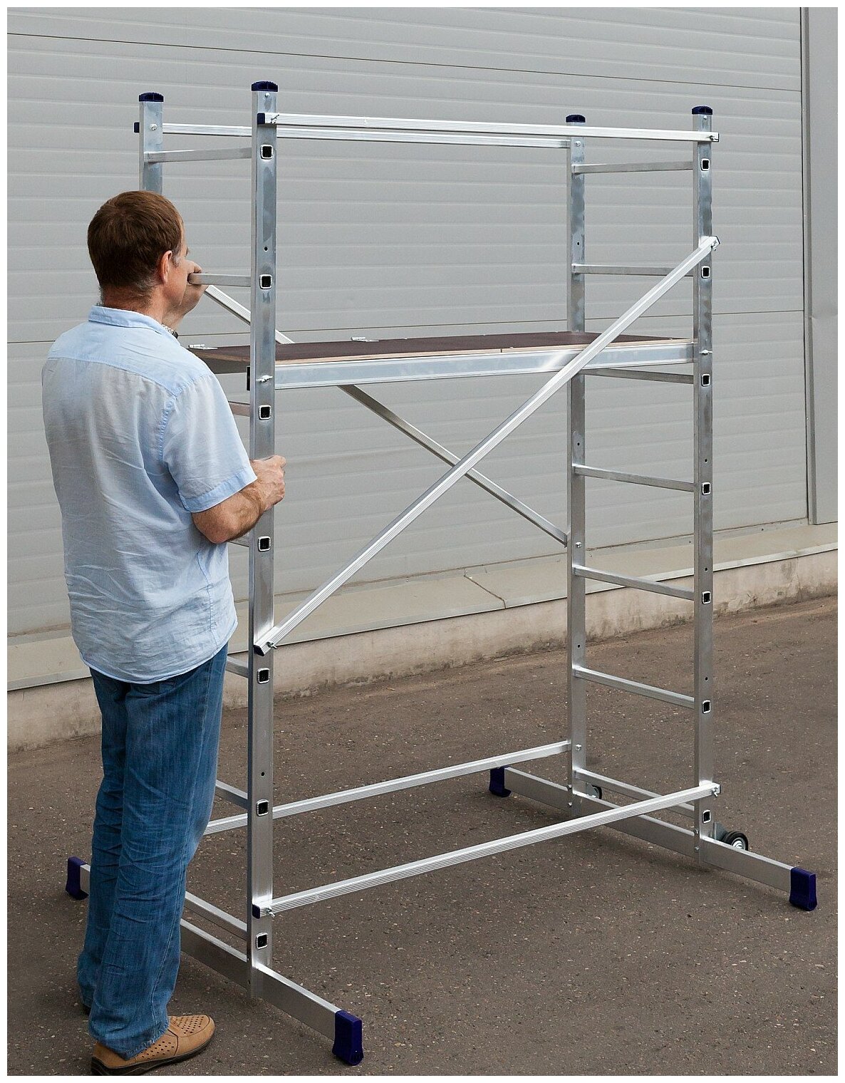 Вышка-тура SIBIN – легкость и удобство эксплуатации благодаря сочетанию надежной конструкции и высококачественных материалов. Вышка-тура это многофункциональная конструкция для ремонтно-отделочных и монтажных работ в доме и на улице. Специальные соединения позволяют легко и быстро собрать вышку . Высоту помоста можно регулировать от перекладины к перекладине, что позволяет устанавливать вышку на различных высотах (лестницах, уступах и т. д.). Надежные опоры, траверсы и стабилизаторы шириной 120 см с пластиковыми заглушками обеспечивают устойчивое положение. Противоскользящие опорные наконечники. Высота: 300 см Количество ступеней: 2х7 Размер рабочей платформы: 140 х 50 см. Максимальная нагрузка: 150 кг. Рабочая высота: 198 см Максимальная высота платформы: 110 см. Ширина секции: 54 см. Ширина стабилизатора:120 см. Вес: 16 кг.