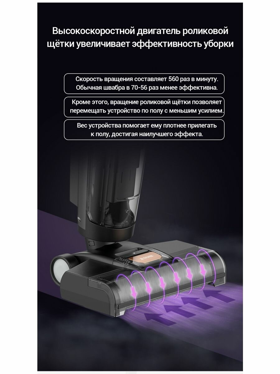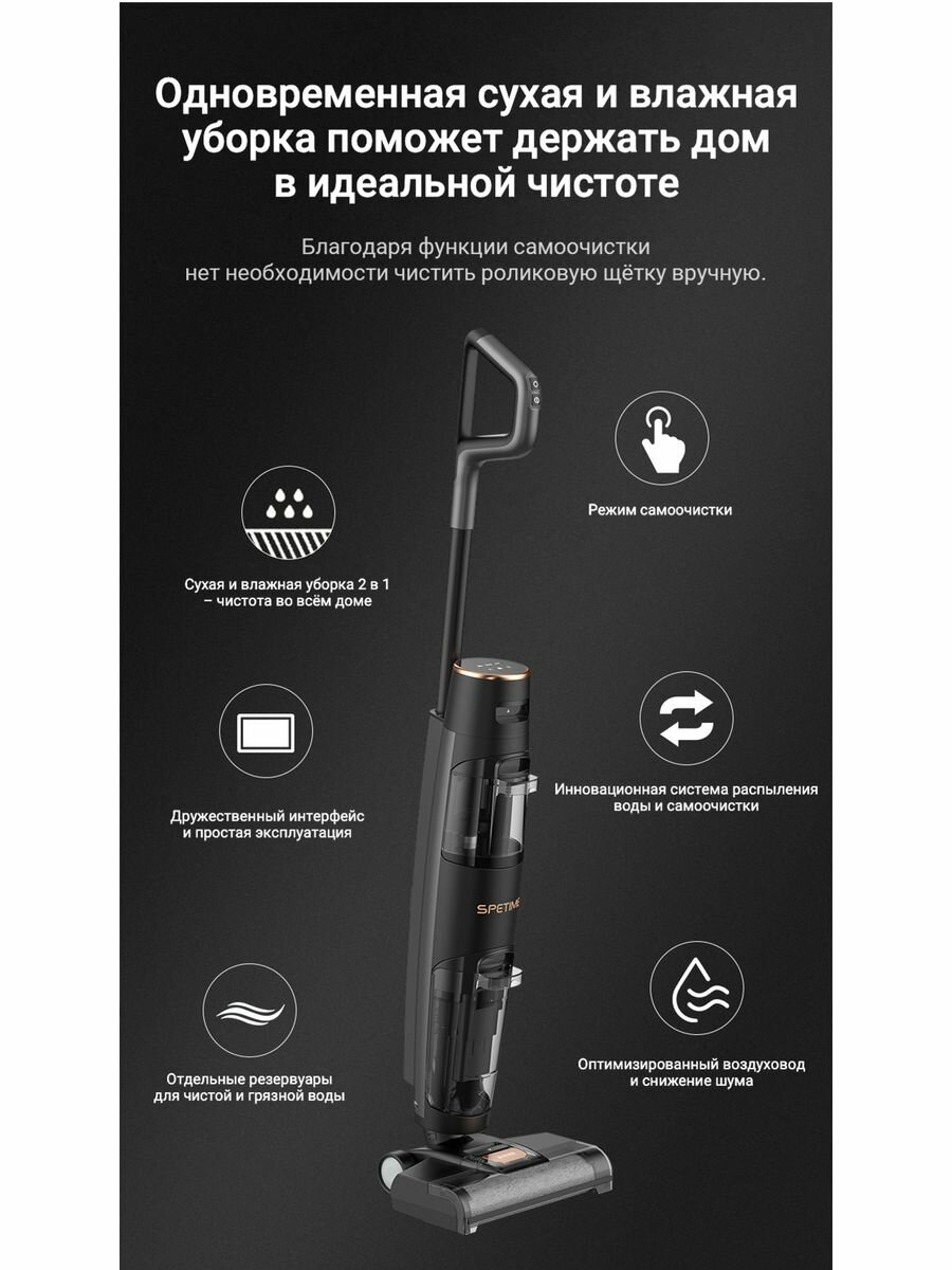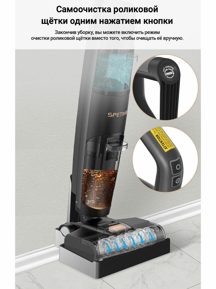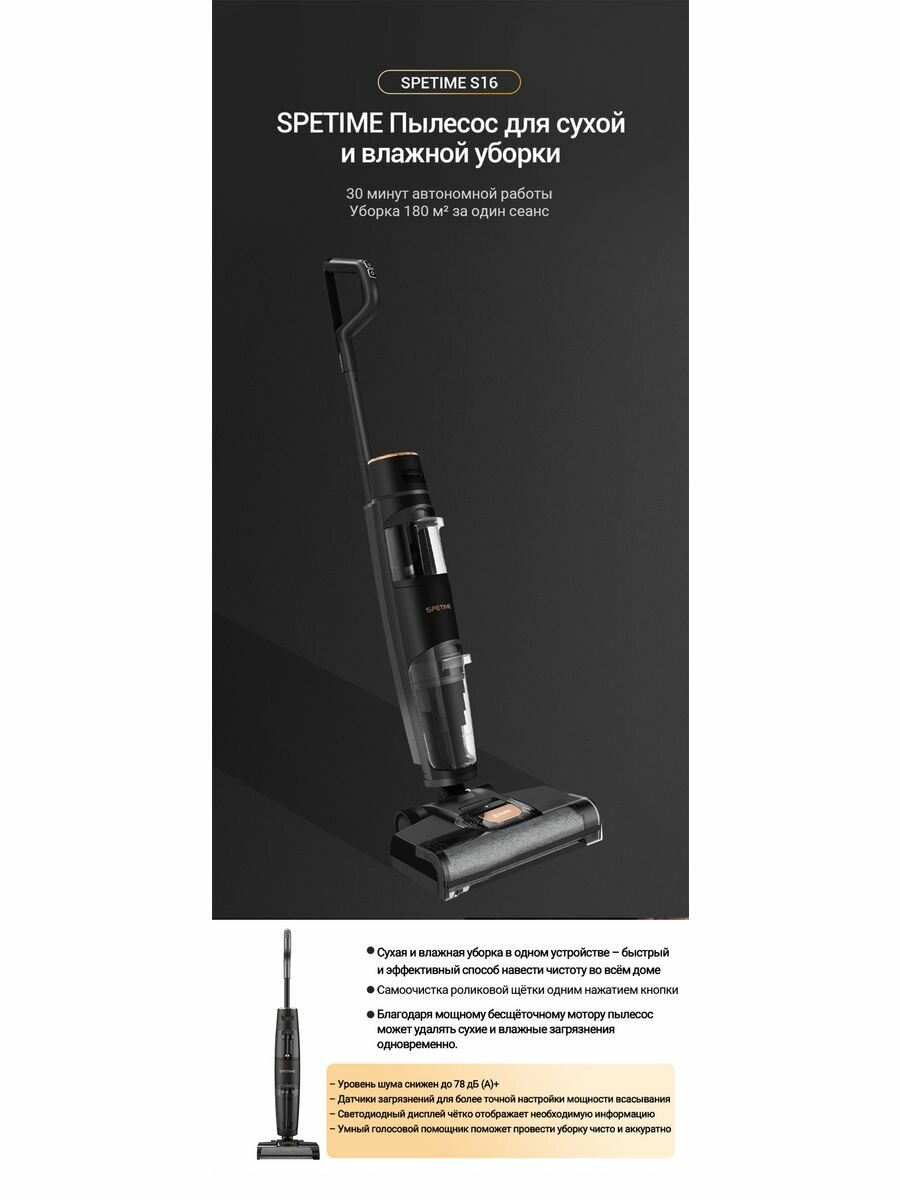 Беспроводной ручной пылесос Spetime S16 собрал в себе все функции топовых беспроводных пылесосов и при этом остался доступным по цене. Он пылесосит и моет пол, оснащен функцией самоочистки роликовой щетки, подходит для любых поверхностей и оснащен голосовой озвучкой. Одновременно сухая и влажная уборка экономит ваше время и силы. Пылесос собирает мусор и моет пол в один проход. В нем предусмотрено два отдельных контейнера для чистой и грязной воды. Пол моется только чистой водой. Пылесос работает до 30 минут без подзарядки и за это время успевает убрать до 180 кв. метров площади. Убрать со Spetime S16 можно во всем доме. В детской пропылесосить мусор, в кухне оттереть пятна, а в ванной собрать пролитую на пол воду. Ролики вращаются со скоростью 560 раз в минуту и полируют пол, а тяжелый вес пылесоса прижимает их к полу для лучшего оттирания пола. Для очистки роликов достаточно нажать на одну кнопку. Вам не потребуется делать это вручную. На экране пылесоса расположены 6 интуитивно понятных индикатора, которые оповещают о состоянии пылесоса.