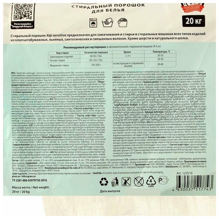 Сервис сравнения цен СкидкаГИД предлагает сравнить цены на товар «Средство моющее синтетическое порошкообразное "Alpi Sensitive" 20 кг Grass (125519)»