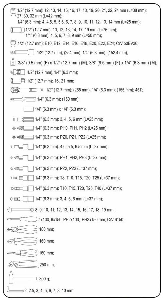 | Торцевые шестигранные головки | 1/2″ (15 шт:12-22, 24, 27, 30, 32 мм), 1/4″ (13 шт:4, 4.5, 5, 5.5, 6-14 мм) |