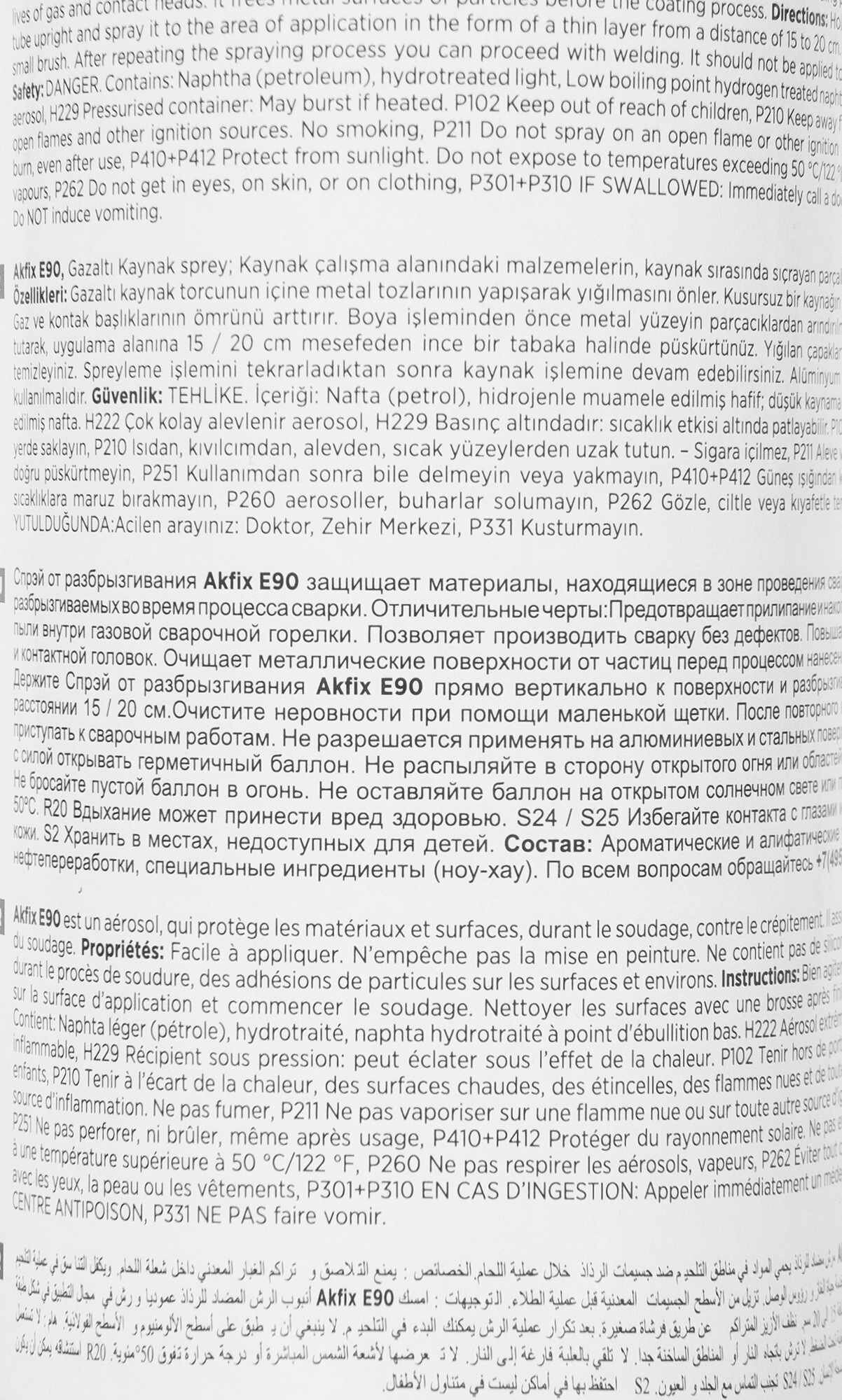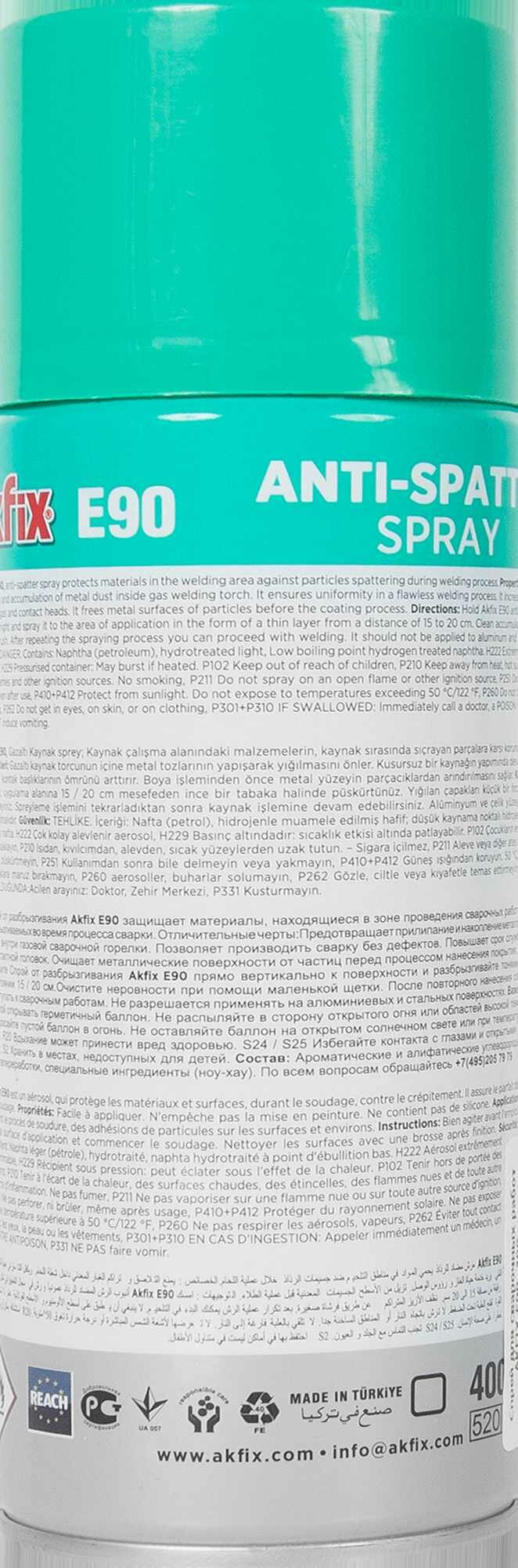 Спрей для сварочных работ Akfix предотвращает прилипание расплавленных брызг к металлической поверхности, а также внутри газовой горелки. Эффективно защищает материалы, находящиеся в зоне проведения сварных работ, форсунки и сопла оборудования. Повышает качество шва, позволяет выполнять сваривание без дефектов. Используется в автоматической и полуавтоматической сварке. Свойства и преимущества спреяНе воспламеняется после испарения растворителя.Обладает пролонгированным действием.Не влияет на качество последующего окрашивания.Продлевает срок службы сопел и форсунок сварочного оборудования.Представляет собой прозрачную жидкость с характерным запахом.При нанесении спрея необходимо соблюдать осторожность: не допускать попадания в глаза, использовать защитные перчатки.Сварка без брызг