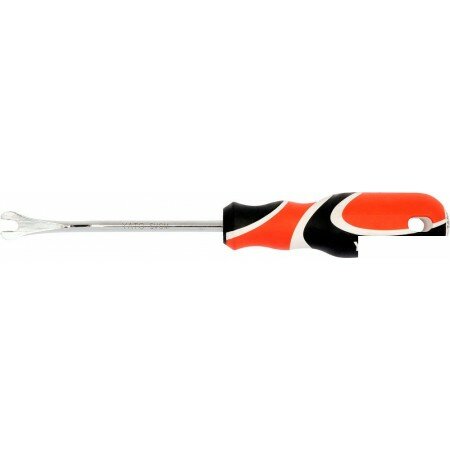 Съемник применяется для демонтажа декоративных накладок обшивок дверей, панелей автомобилей, заклепок и других элементов внутренней обшивки автомобиля. Съемник изготовлен из металла, имеет специальный профиль для использования рычагов при снятии обивки клипс. Преимуществом данного съемника является большая площадь рабочей поверхности, что предотвращает повреждение обшивки и не вызывает появление царапин, которые влияют на интерьер автомобиля. Эргономичная рукоятка изготовлена из двухкомпонентного материала для предотвращения соскальзывания руки.