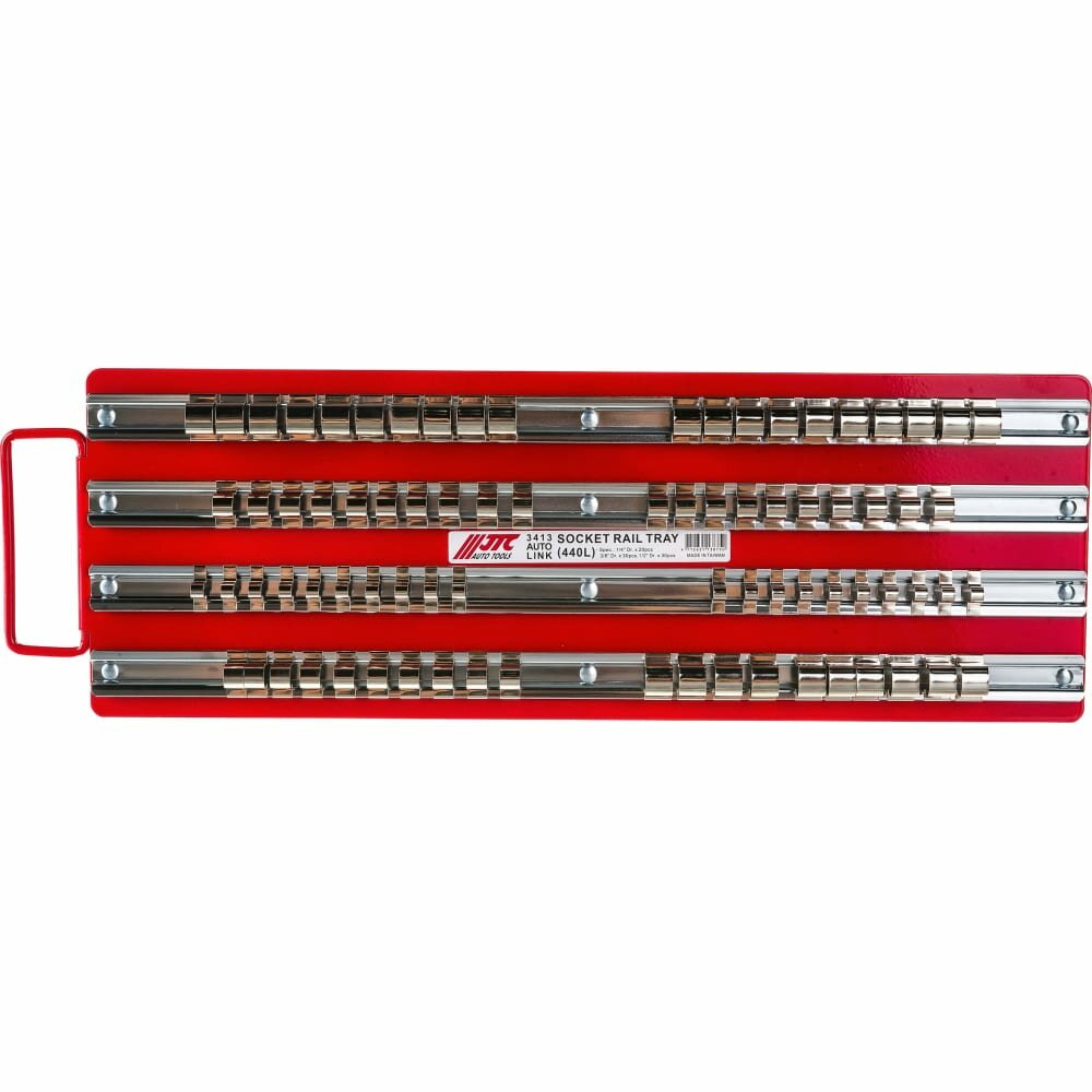 JTC- Лоток с реечными держателями головок предназначены для эргономичного размещения комплектов торцевых головок различных размеров, необходимых в монтажно-демонтажных слесарных работах с крепежом соответствующих форматов.Технические характеристики- Размеры фиксаторов: 1/4" - 20 шт., 3/8" - 30 шт., 1/2" - 30 шт.- Хромированная низкоуглеродистая сталь.- Толщина фиксаторов: 0.3 мм.- Никелированная высокоуглеродистая сталь.- Толщина лотка: 0.8 мм., красный, покрытие - эмаль горячей сушки.- Габаритные размеры: 432/152/23 мм. (Д/Ш/В)- Толщина держателя: 0.8 мм.- Размеры: 440х150 мм.- Вес: 810 гр.