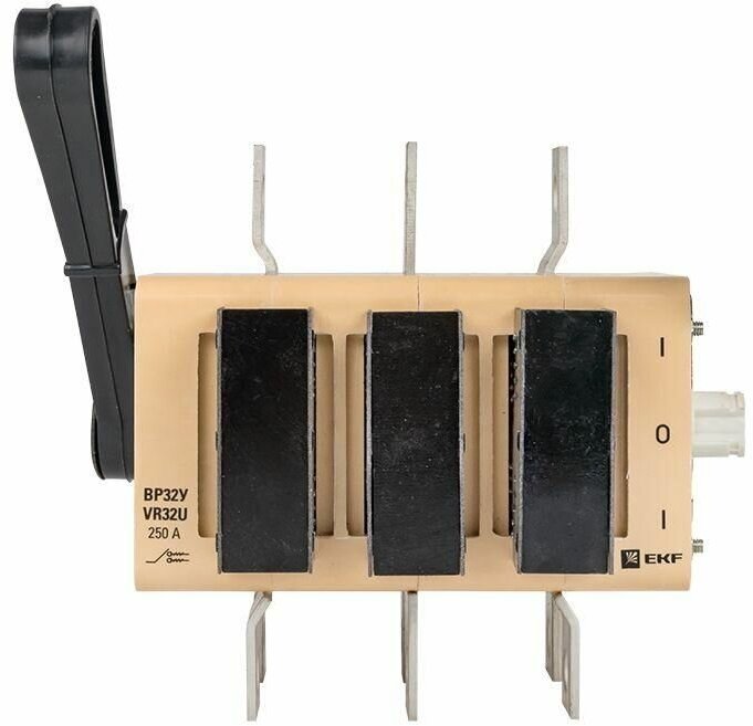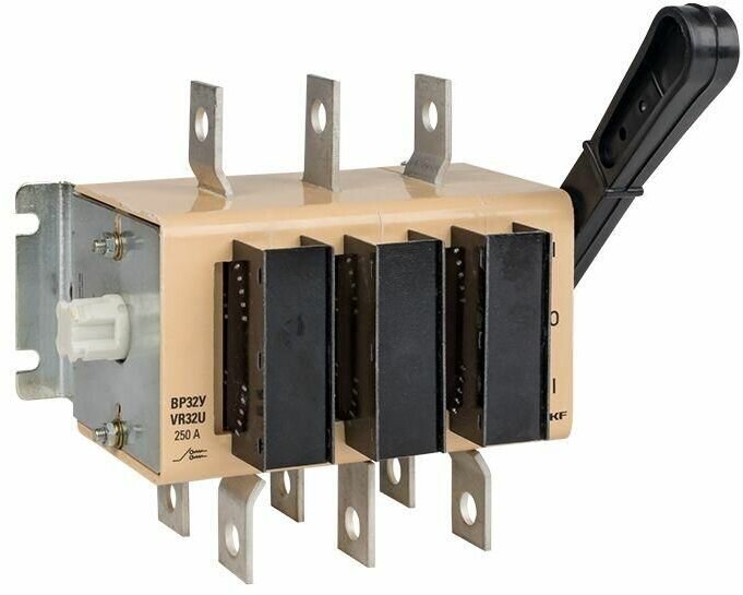 Выключатели-разъединители ВР32У (универсальные) серии MAXima предназначены для ручного включения-отключения цепей переменного тока с номинальным напряжением до 690 В частотой 50 Гц. В конструкции применена трехполюсная контактная система ножевого типа с двойным видимым разрывом цепи. С помощью двойного разрыва цепи, больших растворов контактов и дугогасительных камер обеспечивается эффективное гашение электрической дуги при коммутации нагрузок, что препятствует преждевременному и чрезмерному износу контактов. Конструкция контактных выводов обеспечивает болтовое присоединение шин или проводников, оконцованных кабельными наконечниками. Все рубильники являются универсальными по типу присоединения рукоятки. Конструкция рубильника предусматривает установку рукоятки как справа от корпуса, так и слева. Расположение рукоятки, левое или правое, можно поменять в процессе эксплуатации при необходимости. Расположение плоскости присоединения внешних зажимов контактных выводов перпендикулярно плоскости монтажа. Выпускается несколько исполнений ВР32У: • на одно и на два направления; • с несъемной рукояткой; • со съемной смещенной рукояткой.