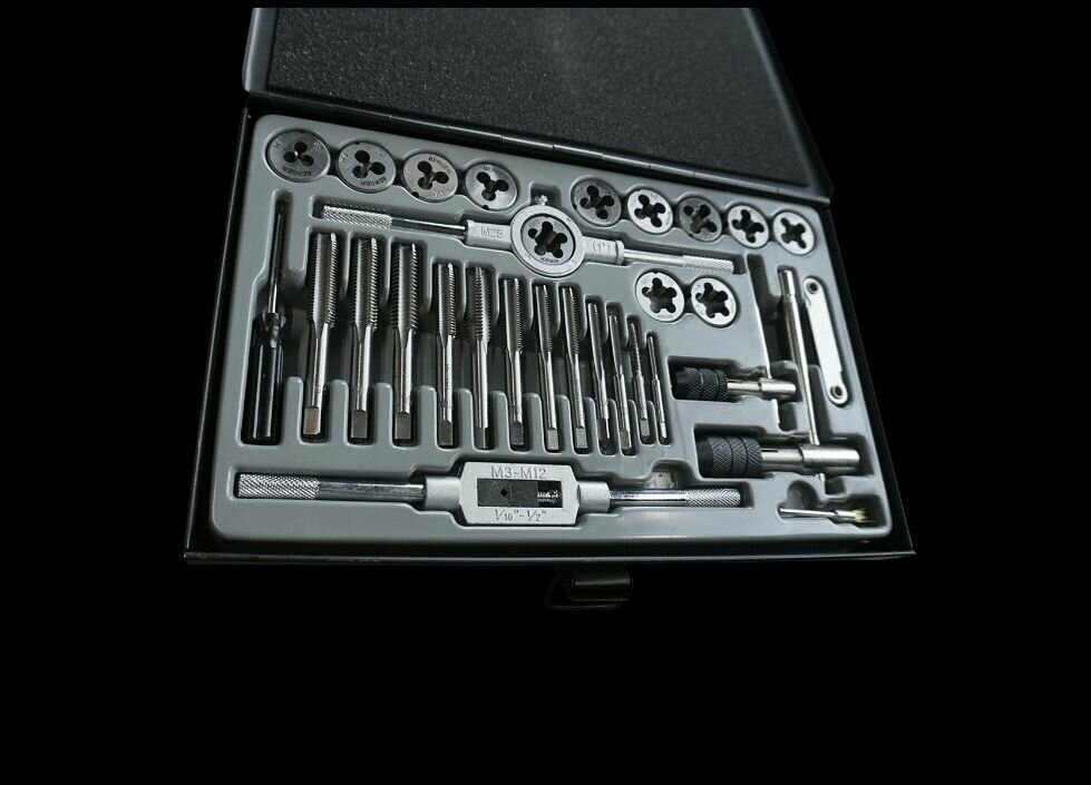 | Инструменты в наборе | метчик (12 шт.:однопроходной:М3×0.5;М4×0.7; М5×0.8; М6×1.0; М8×1.0; ), метчикодержатель, плашка (12 шт. |