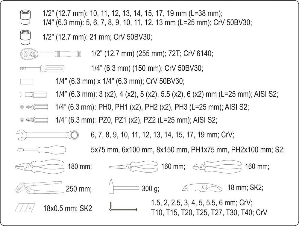 | Инструменты | Пассатижи, Трещотка, Клещи, Длинногубцы, Молоток, Головки, Ключи, Биты, Нож, Кусачки, Отвертки, Адаптер для бит |