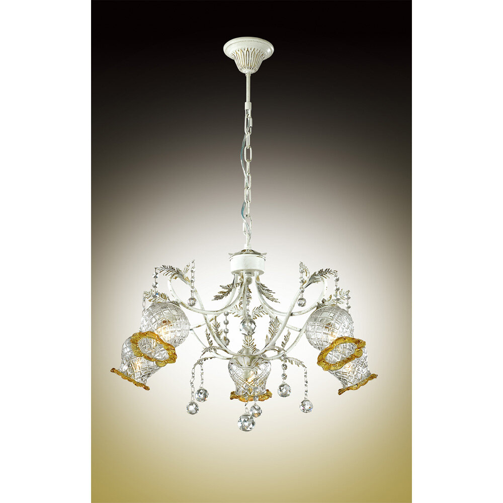 "Люстра серии Timora выполнена в классическом стиле. Люстра изготовлена из металла с белым покрытием и золотой патиной. Классичесский дизайн данной модели прекрасно подойдет к любому интерьеру и станет его незаменимым дополнением, плафоны выполнены из стекла в сочитани двух цветов, прозрачного и янтарного, декорирована люстра хрустальными подвесками . Цоколь Е14. Мощность 5х60W. Тип крепления ""крюк"". Нет ламп в комплекте."