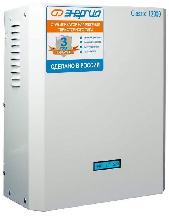 Однофазный стабилизатор напряжения ЭНЕРГИЯ Classic 12000. Однофазный тиристорный стабилизатор мощностью 12 кВА . Отличный вариант для коттеджа, частного дома или дачного участка. . Выдерживает большие перегрузки и отрицательные температуры. Погрешность стабилизации ±5%.