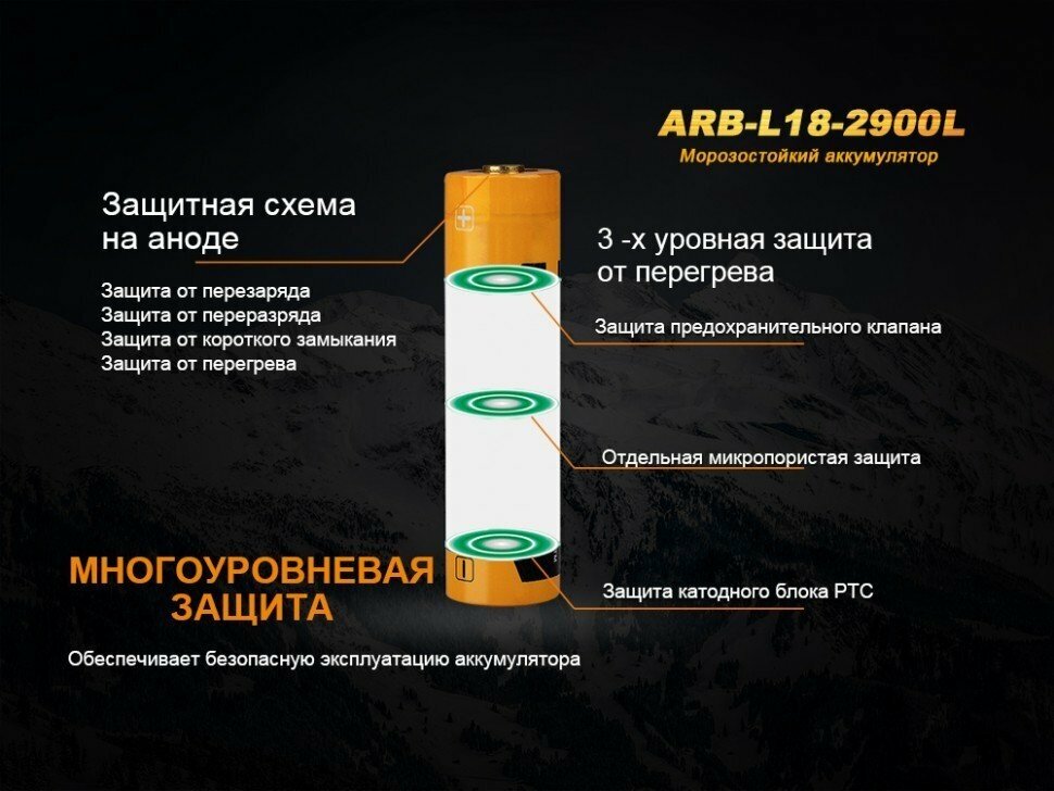 Аккумулятор ARB-L18-2600 оснащен сразу несколькими степенями защиты - защита от перегрева, защита от перезаряда, защита контактов из нержавеющей стали В данном случае при достижении примерно 2,4В защита разрывает электрическую цепь, не давая ему переразрядиться. А также, плата не позволит Fenix ARB-L18-2600 перезарядить во избежание взрыва. Ко всем его достоинствам, у него имеется защита по температуре, что не даёт перегрева во время заряда.