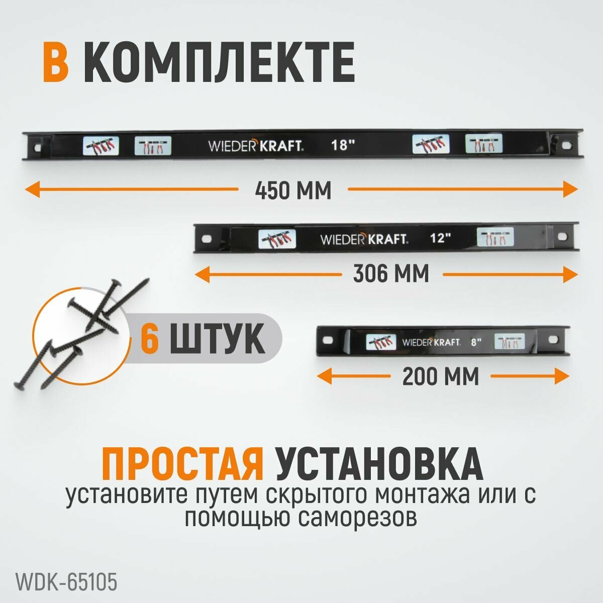 Магнитные держатели для инструмента WIEDERKRAFT 3 шт , также известные как магнитные диспенсеры, предназначены для закрепления к стене или стенде. Используется для размещения и хранения различного инструмента и других металлических предметов.3 отдельных магнитных полоски, длина 18 (450 мм), 12 (306 мм) и 8 дюймов (200 мм), в комплекте всего 6 крепежных винтов с крестообразным шлицем (по 2 на каждую планку).Плоский кронштейн держателя из твердой стали с черным покрытием и сильным магнитным усилием захватывает и надежно удерживает все, что магнитится - легко привинчивается к любой стене или рабочему столу и позволяет повесить большинство инструментов без падения - полоски могут быть размещены в одну линию, либо друг под другом.Просто установите магнитные держатели путем скрытого монтажа, либо с помощью саморезов, которые входят в комплект, а затем просто поднесите металлический предмет и наблюдайте, как магниты выхватывают его прямо из руки и надежно удерживают!Прочный захват самого тяжелого железа в доме, офисе, мастерской, на стенах гаража, кухонных прилавках, планках, инструментальных тележках или в любых суровых условиях - полезно для хранения такого инструмента как отвертки, молотки, гаечные ключи, удлинители, трещотки, плоскогубцы, головки, пилы, крепежные детали, ножи, ножницы, шурупы, рулетки или любых других предметов из черных металлов.