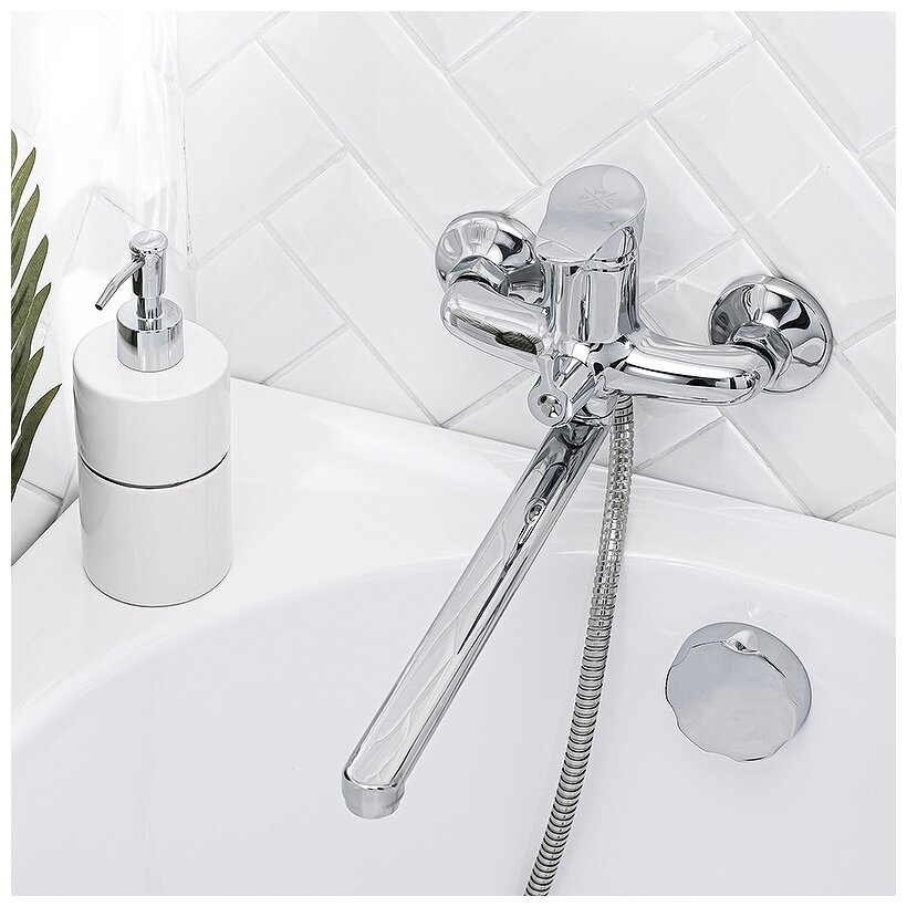 Смеситель для ванны с длинным изливом. Картридж: керамический 35 мм. Евро-переключение на душ. Поворотный прямой излив. Аэратор: пластиковый. В комплекте: шланг, лейка для душа, эксцентрики, отражатели.