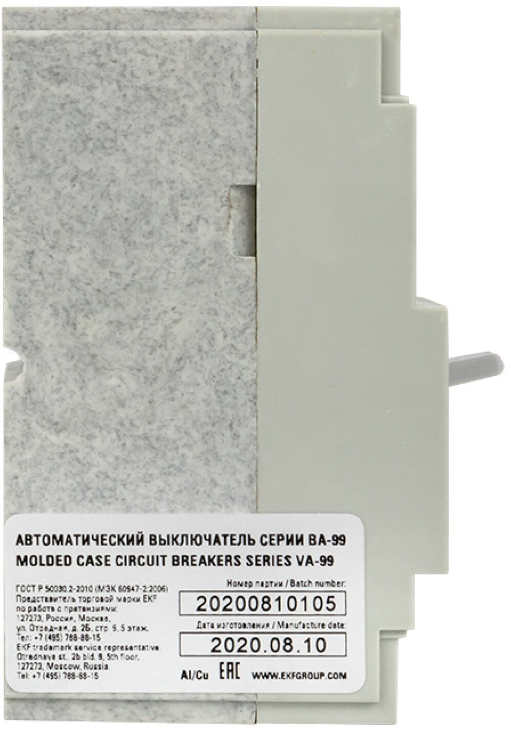 Выключатель ВА-99 выполнен в виде моноблока и состоит из основания и крышки с фальшпанелью, в которой имеется окно для рукоятки управления и толкатель кнопки «Тест»-проверки механизма отключения выключателя.