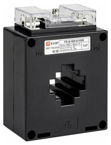 • назначение Трансформаторы тока ТТЭ (без встроенной шины с универсальным окном), ТТЭ-А (со встроенной шиной) торговой марки EKF используются для преобразования и передачи сигнала измерительной информации на устройства управления и защиты, а также измерительные приборы. Предназначены для электросетей, в которых переменный ток имеет номинальное напряжение не более 660 В и частоту 50 Гц. • Область применения Применяются в приборах релейной защиты и устройствах для измерения тока благодаря своей высокой точности. Трансформаторы тока могут монтироваться в вводно-распределительных и иных устройствах, предназначенных для учета расхода электроэнергии в промышленности, на транспорте, сельском хозяйстве и коммунально-бытовом секторе. • Принцип действия Принцип действия трансформатора тока заключается в преобразовании переменного тока промышленной частоты в переменный ток, необходимый для измерения с помощью стандартных измерительных приборов. Также трансформатор изолирует измерительные цепи от основной силовой цепи, имеющей высокое напряжение (до сотен киловольт). За счет этого обеспечивается безопасность измерений. • Дополнительные принадлежности ИЛИ аксессуары В стандартной комплектации имеются: 1. Держатели для крепления на шине (кроме модификации ТТЭ-А); 2. Винты для крепления на шине (кроме модификации ТТЭ-А).