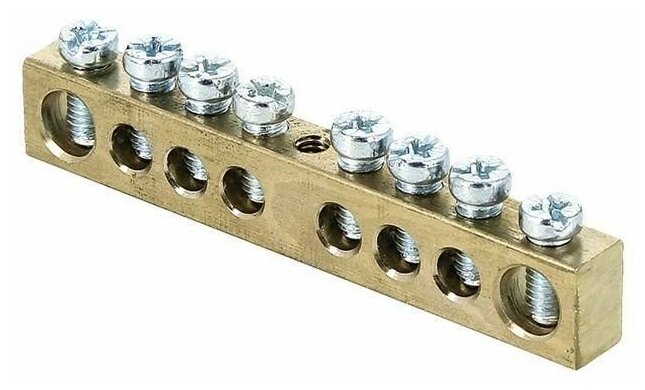 Шина зазем. без изолят. РЕ 63.08 ЭКФ – аксессуар щитового оборудования. Габариты: 58 x 9 x 6 мм. Изготовлен из латуни. Защищен никелевым покрытием. 8 отверстий: диаметром 6,5 мм (2 шт.) и 4,5 мм (6 шт). Предусмотрено подключение 8 проводников.
