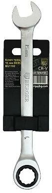 Тип: Ключ; Количество в комплекте: 1; Рабочие размеры ключа: 15; Прочие особенности и свойства: Комбинированный трещоточный ключ 15мм Berger BG активно используется в профессиональной сфере для монтажа и демонтажа резьбовых соединений. Корпус изделия выполнен из высококачественной стали, стойкой к износу и коррозии. Конструкция ключа включает U-образный зев и накидной трещоточный с 72-зубцовым механизмом.; Вес: 0.19