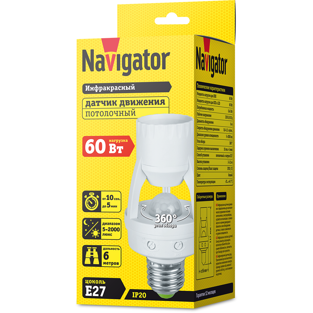 Многофункциональные электронные сенсоры движения предназначены для включения освещения при наличии в зоне контроля сенсоров движущихся объектов (людей). Сенсоры автоматически включат световые приборы при появлении человека в зоне контроля, и также автоматически выключат их через определенное время при отсутствии движения объектов в контролируемой зоне. Выключатель Navigator обладает высокой стабильностью работы, многофункциональностью, практичностью, широким диапазоном питающего напряжения, удобством установки, индикацией обнаружения объектов, многовариантностью рабочего режима, приятным дизайном. Применяется для автоматического контроля работы электроприборов в квартирах, на предприятиях или в гостиницах. Коммутация нагрузки выполняется электромеханическим реле.