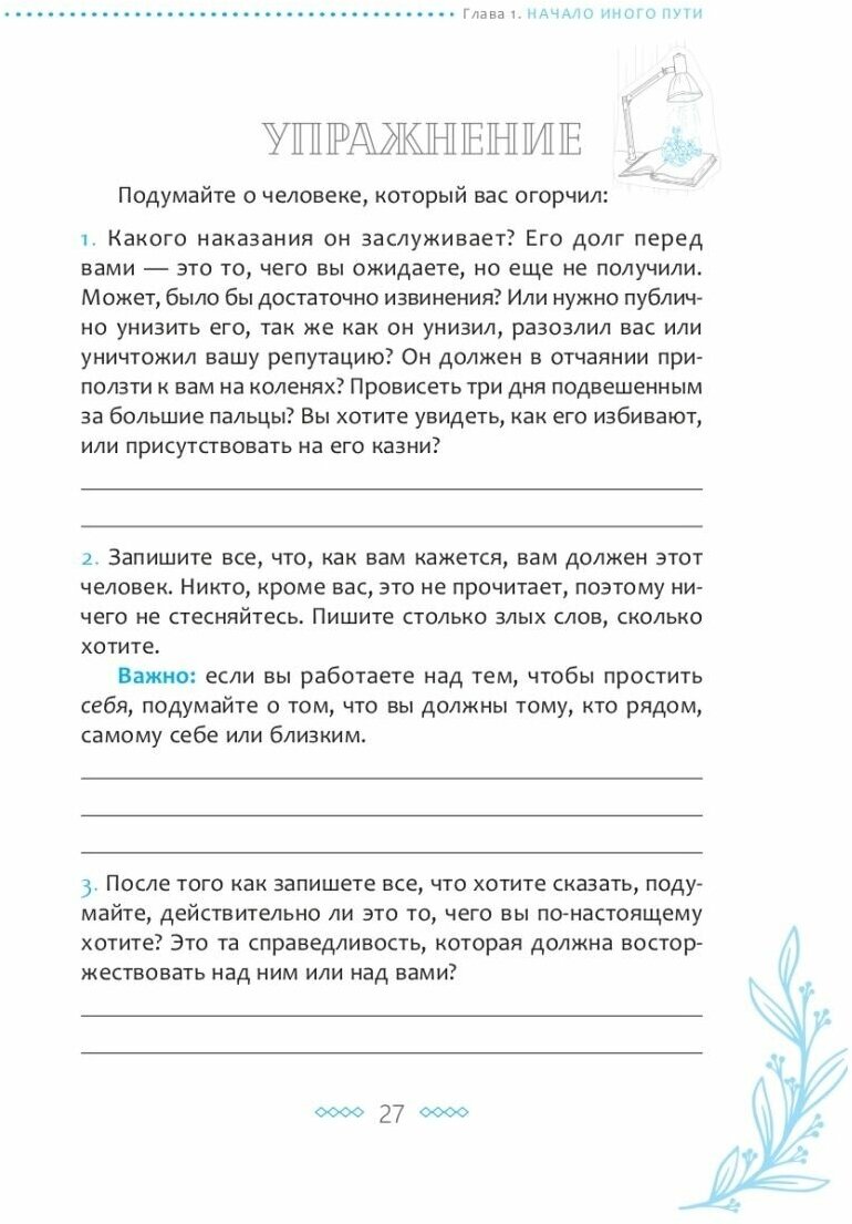 «Я предоставлю вам набор техник прощения и упражнений, основанных на практиках, проверенных опытом и временем. Эти практики были разработаны в лучших исследовательских институтах мира и на протяжении десятилетий использовались в психологии, социологии, в области управления стрессом и конфликтами. Цель этой книги — выстроить план действий, который позволит читателю простить себя и других. Когда человек прощает, он приносит спокойствие в этот мир. Чем больше людей научится прощать и обретать от этого силу, тем больше покоя будет в мире».