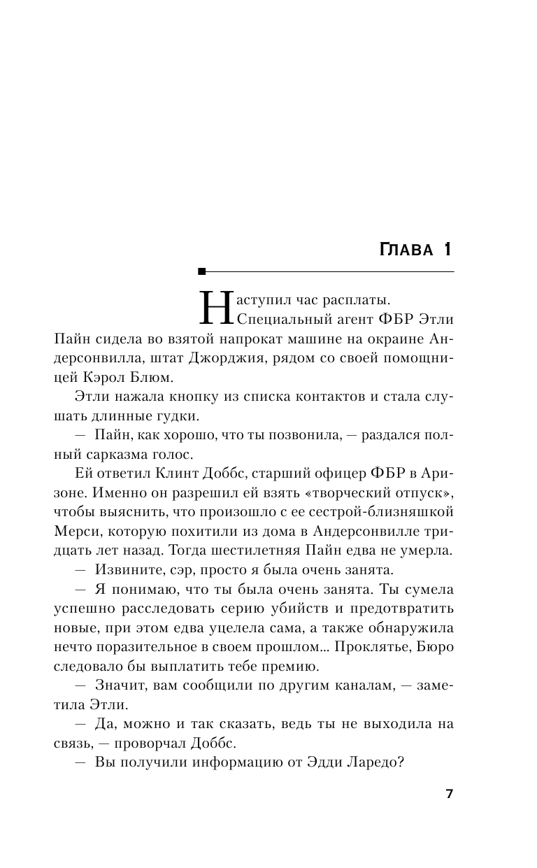 В памяти у Этли Пайн, словно стальная заноза, засело воспоминание: ей шесть лет, и вторгшийся в их дом мужчина выбирает с помощью детской считалки между ней и сестрой-близнецом Мерси. Останавливается на Мерси и уносит ее с собой. Больше Этли никогда не видела сестренку…