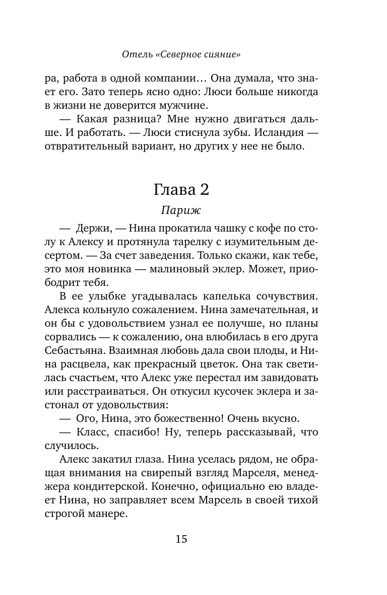 Милая, жизнеутверждающая история с лёгкой любовной линией. Эта книга идеальна для того, чтобы с ней расслабиться, отдохнуть и отвлечься от серых будней. Приятный слог, пейзажи Исландии, снежные просторы, атмосфера уютного маленького отеля — всё это позволяет отправиться в морозное путешествие вместе с героями книги.