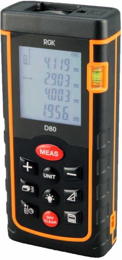 Лазерный дальномер RGK — универсальный измеритель расстояния для строителей, архитекторов, инженеров, дизайнеров и других специалистов, работающих с точными планами помещений, зданий и придомных районов. Дальность измерений — 80 метров. Дальномер RGK будет полезен и в квартирах, и в крупноразмерных зданиях — торговых центрах, заводских комплексах и офисах open-space. Точность измерения — ±2 мм на всём диапазоне измерений и даже при ярком солнечном свете.