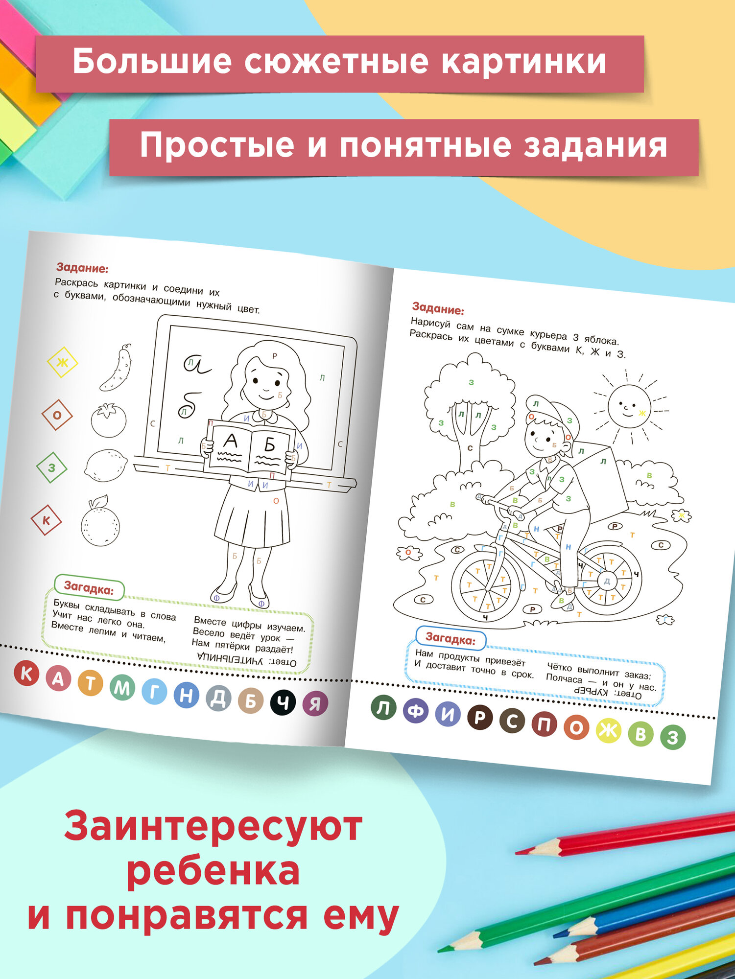 Раскраски по буквам помогут ребёнку весело и с пользой провести время, в игровой форме развивая у него внимание и память. Весёлые задания направлены на стимуляцию мелкой моторики и мышления, а также помогут закрепить начальные навыки счёта, чтения и письма. Ребёнок легко запомнит названия цветов и повторит буквы алфавита, а авторские загадки и стихи с договариванием на каждой странице, сопровождаемые ответами, прекрасно подойдут для первого самостоятельного чтения.