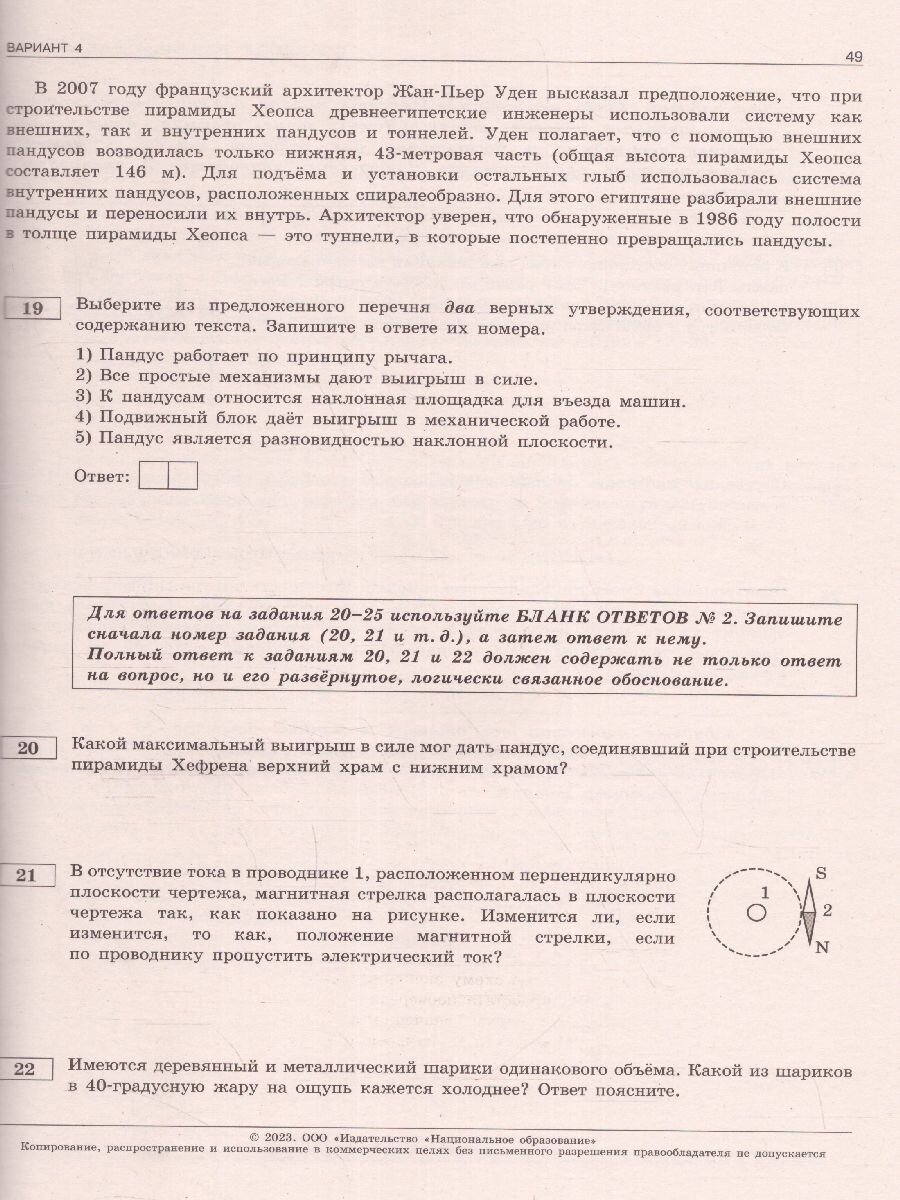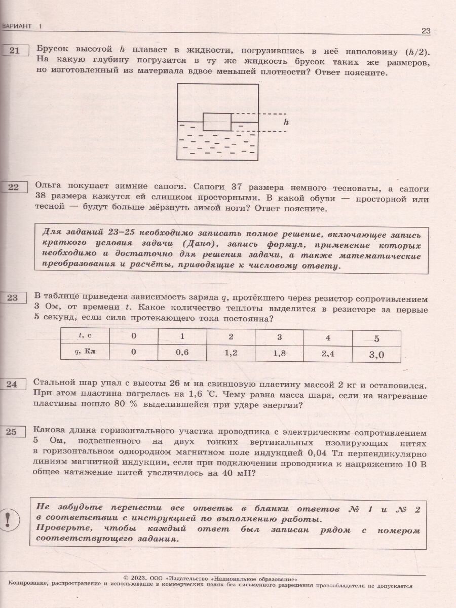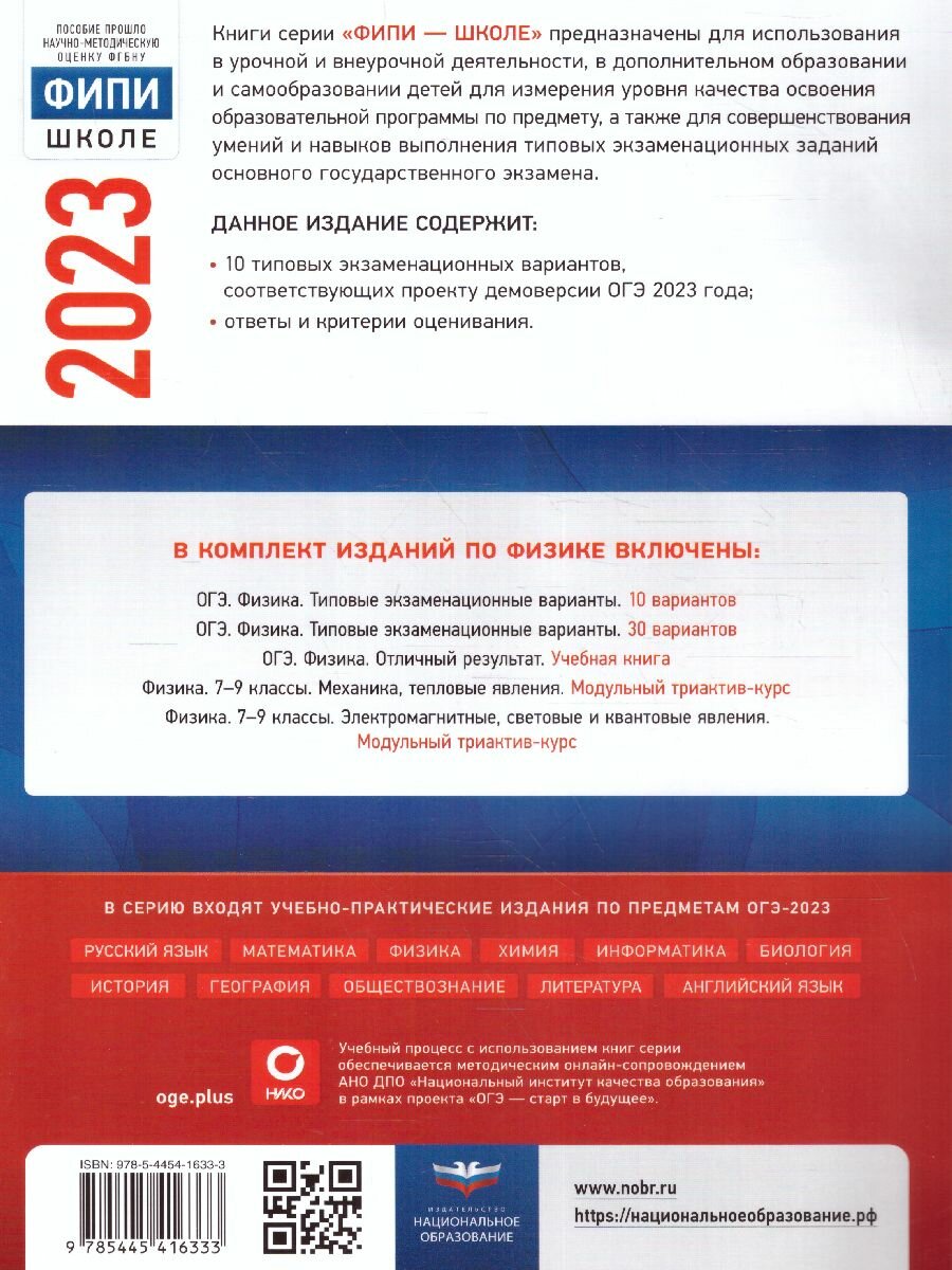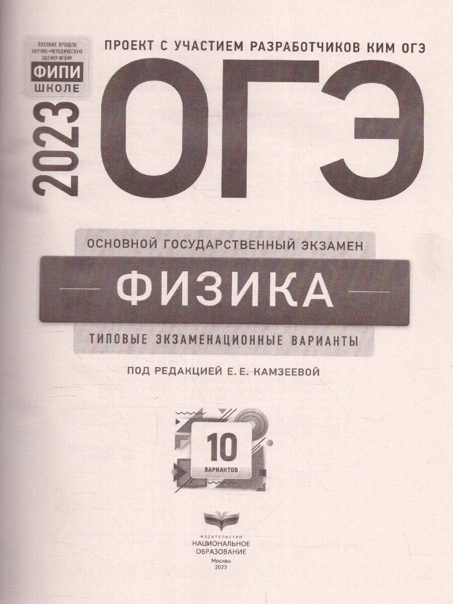 Серия подготовлена разработчиками контрольных измерительных материалов (КИМ) основного государственного экзамена. В сборнике представлены:• 10 типовых экзаменационных вариантов, составленных в соответствии с проектом демоверсии КИМ ОГЭ по физике 2023 года;• инструкция по выполнению экзаменационной работы;• ответы ко всем заданиям;• решения и критерии оценивания заданий.Выполнение заданий типовых экзаменационных вариантов предоставляет обучающимся возможность самостоятельно подготовиться к государственной итоговой аттестации в 9 классе в форме ОГЭ, а также объективно оценить уровень своей подготовки к экзамену.Учителя могут использовать типовые экзаменационные варианты для организации контроля результатов освоения школьниками образовательных программ основного общего образования и интенсивной подготовки обучающихся к ОГЭ.