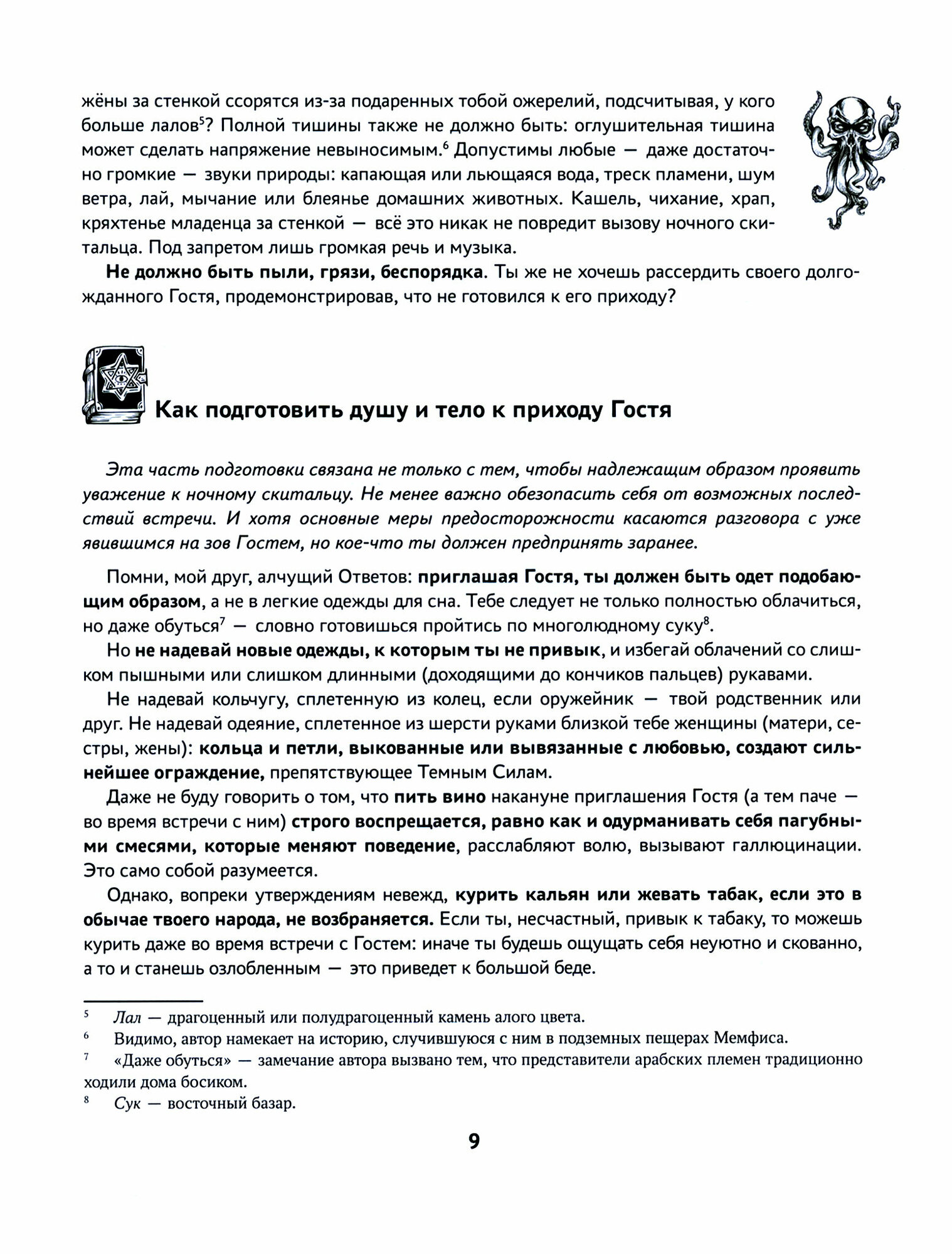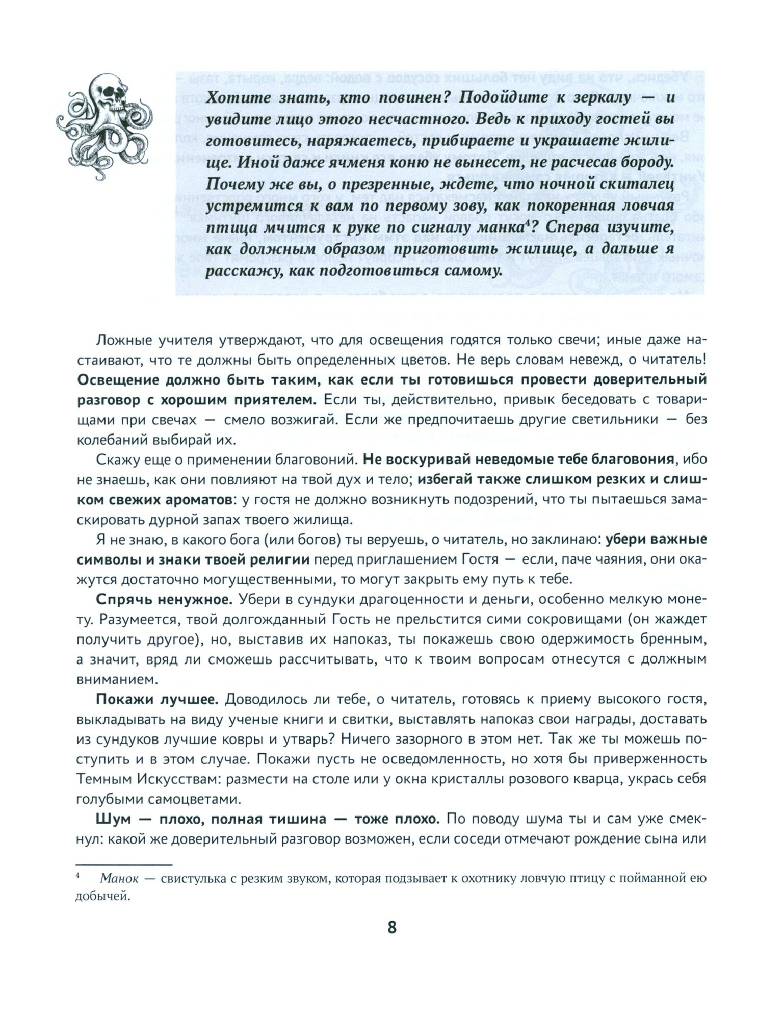 Только безумцы ждут, что ночной скиталец устремится к ним по первому зову, как покоренная ловчая птица мчится к руке по сигналу манка! Сперва изучите, как должным образом приготовить жилище и подготовиться самому, какие слова нельзя произносить и какие вопросы не подобает задавать.