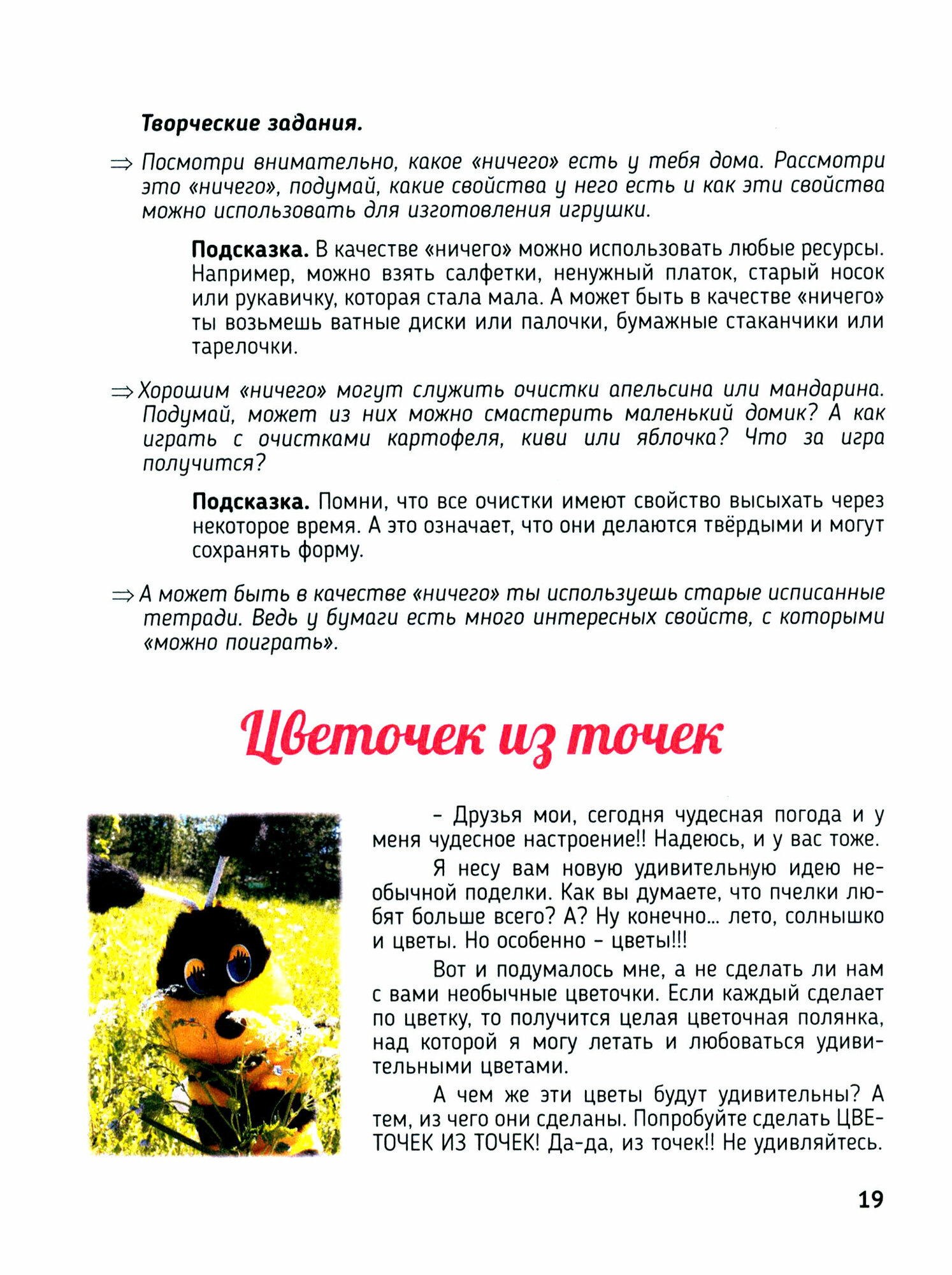 В книге собраны короткие беседы с весёлой пчёлкой Пчелитой, в которых Пчелита знакомит детей с разными играми, задачами, упражнениями. Все эти "встречи" направлены на развитие творческого мышления и фантазии ребёнка, а именно: на развитие образно-ассоциативного мышления, умения выделять и использовать ресурсы, на развитие вариативности, гибкости мышления, развитие речи детей.