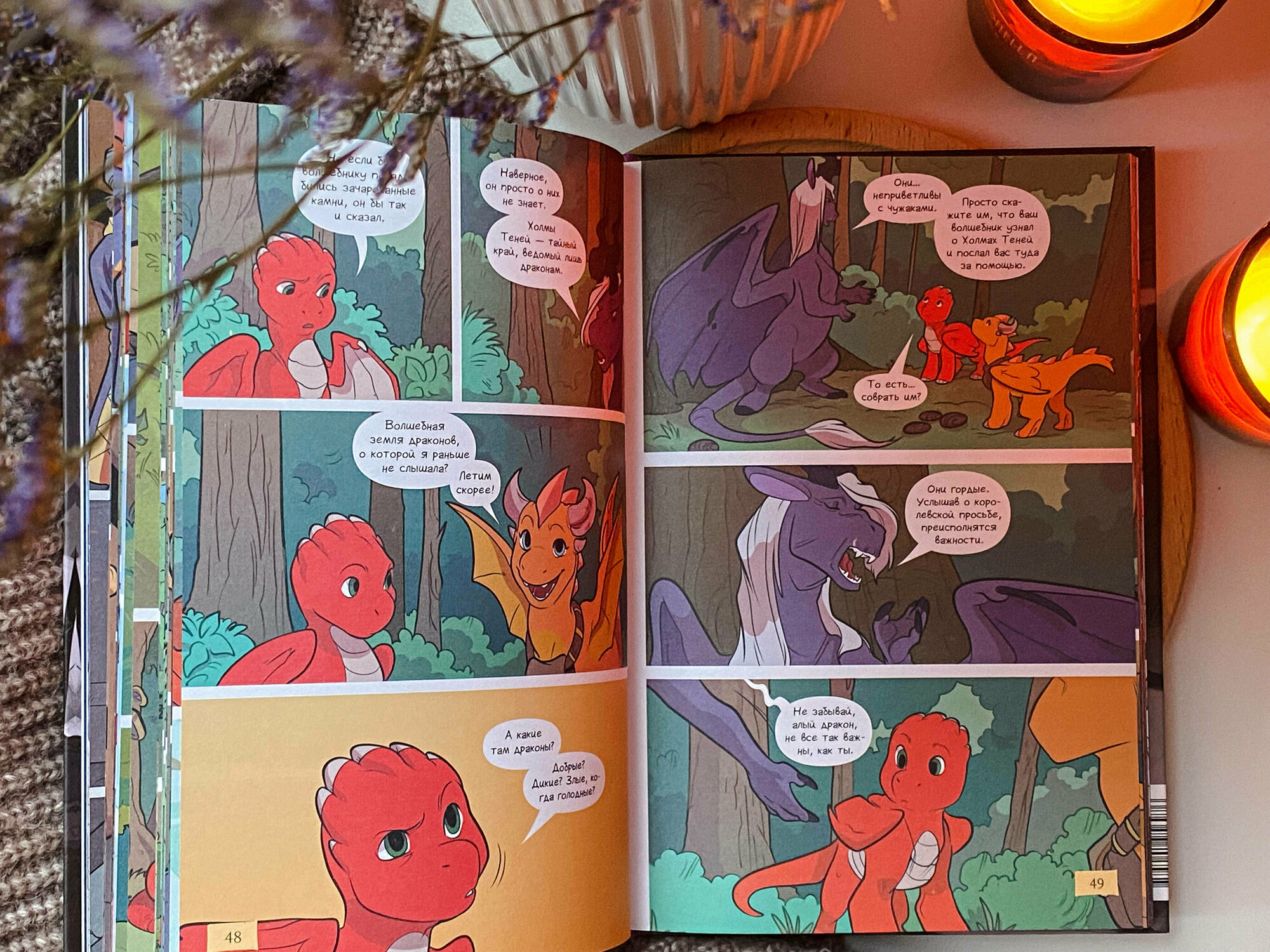 Продолжение приключений смелых драконов или дракончиков) потому как главные герои совсем ещё маленькие, но такие отважные, дружные..сюжет знаю из описания, это , наверное, первые книги, которые я не читала с ребенком)) решила познакомить своего юного читателя с комиксами, выбор сделала на первой части, как только она вышла у МИФа. и как оказалась, совсем не прогадала, ребенок ее самостоятельно просто "проглотил", в конце сразу же попросив дать продолжение почитать