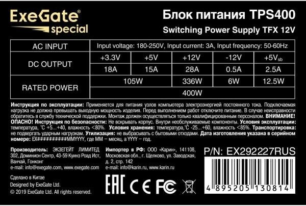 ExeGate TPS400 предназначен для промышленного использования. Мощности рассматриваемой модели будет достаточно для стабильной работы системы начального уровня. За эффективное охлаждение устройства, даже на пиковых нагрузках, отвечает вентилятор диаметром 80 мм. Блок питания имеет разъем 24-pin для материнской платы, 4+4-pin для процессора, 3 SATA для питания жесткого диска и оптического привода, Molex для подключения старых жестких дисков и некоторых других устройств. Благодаря многоуровневой защите БП обеспечит безотказную работу системы.